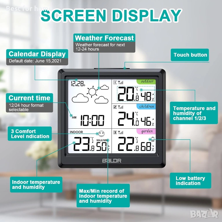 Мултифункционален дисплей: Показва час (12/24ч), дата, ден от седмицата (на 7 езика), вътрешна/външна температура (°C/°F) и влажност.