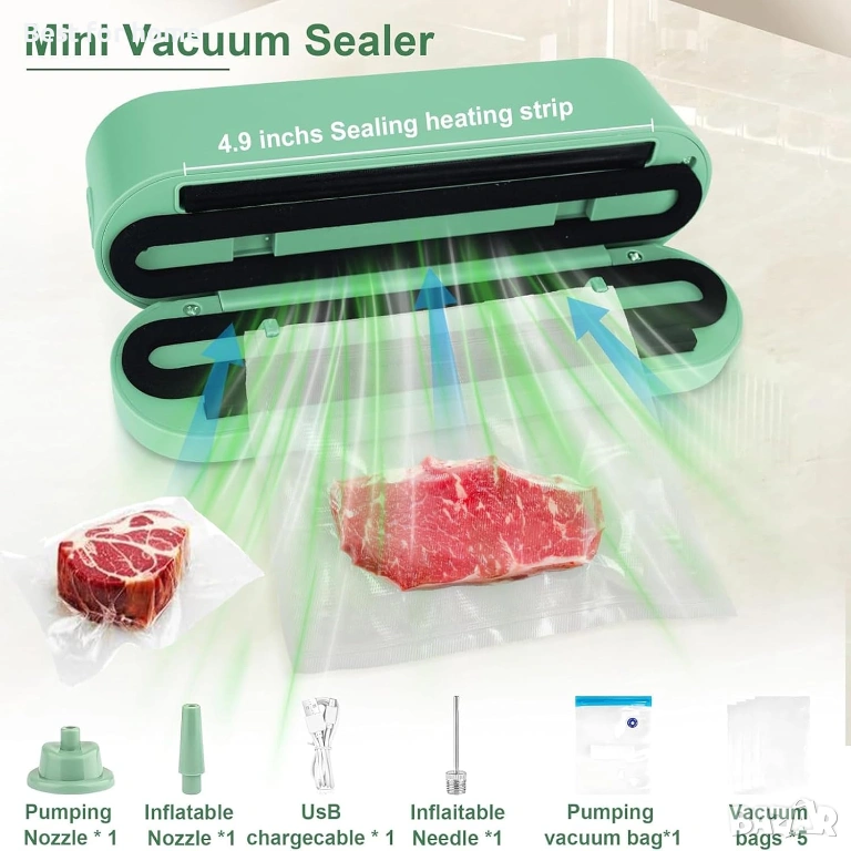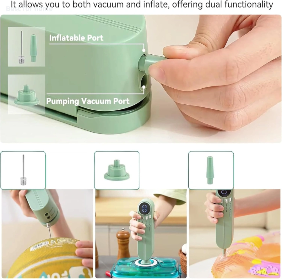 Мултифункционалност: Освен за храна, уредът разполага с външна функция за изсмукване на въздух от вакуумни контейнери и функция за надуване (баскетболни топки, плувни пояси и др.).