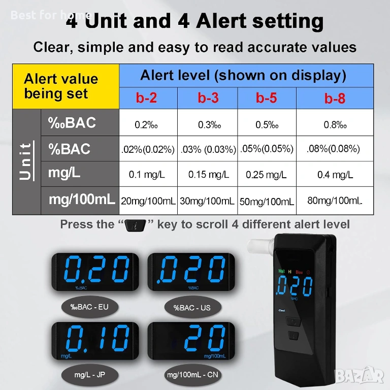 Интелигентни режими и аларми: Резултатите се извеждат на голям LED дисплей в различни единици по избор (%BAC, ‰BAC, mg/L или mg/100ml). Можете да настроите 4 нива на предупреждение със звукови и визуални сигнали при превишаване на лимита.