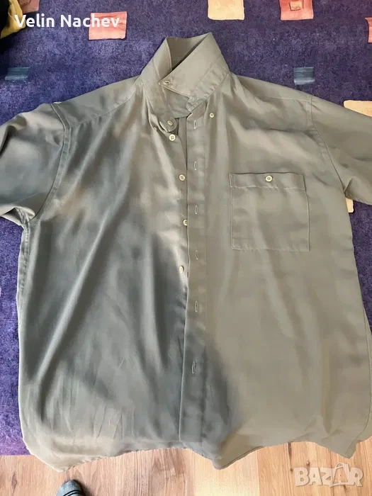 * Риза: Едноцветна, в светъл сив или сребрист цвят. С класическа кройка и джоб на гърдите.