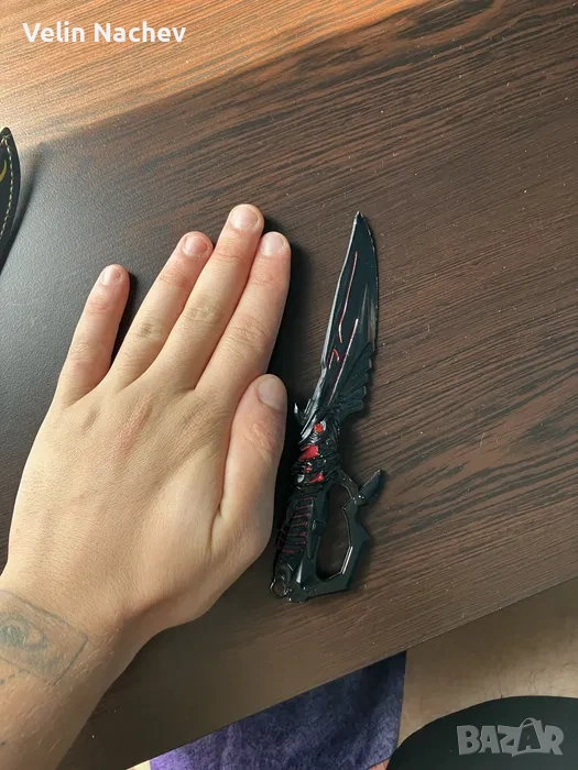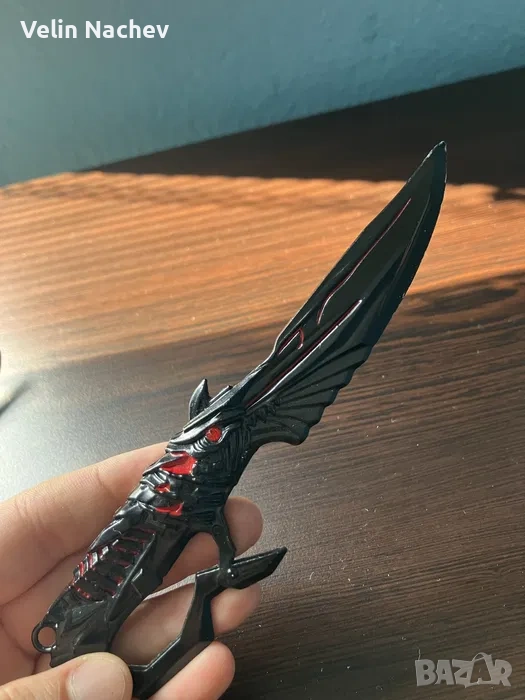 Със своя футуристичен дизайн в черно и живи червени акценти, той е идеалното допълнение към всяка колекция или уникален акцент за интериора. Изработен с внимание към детайла, този декоративен нож ще привлече погледите и ще добави нотка загадъчност и стил. Перфектен за подарък или за да обогатиш собствената си колекция от интересни предмети!