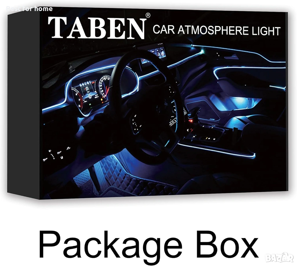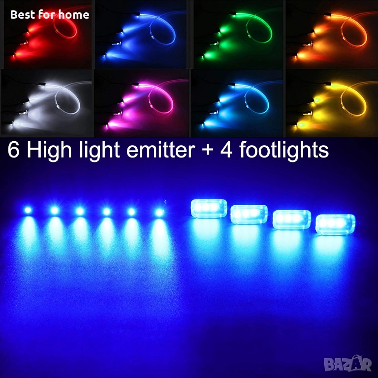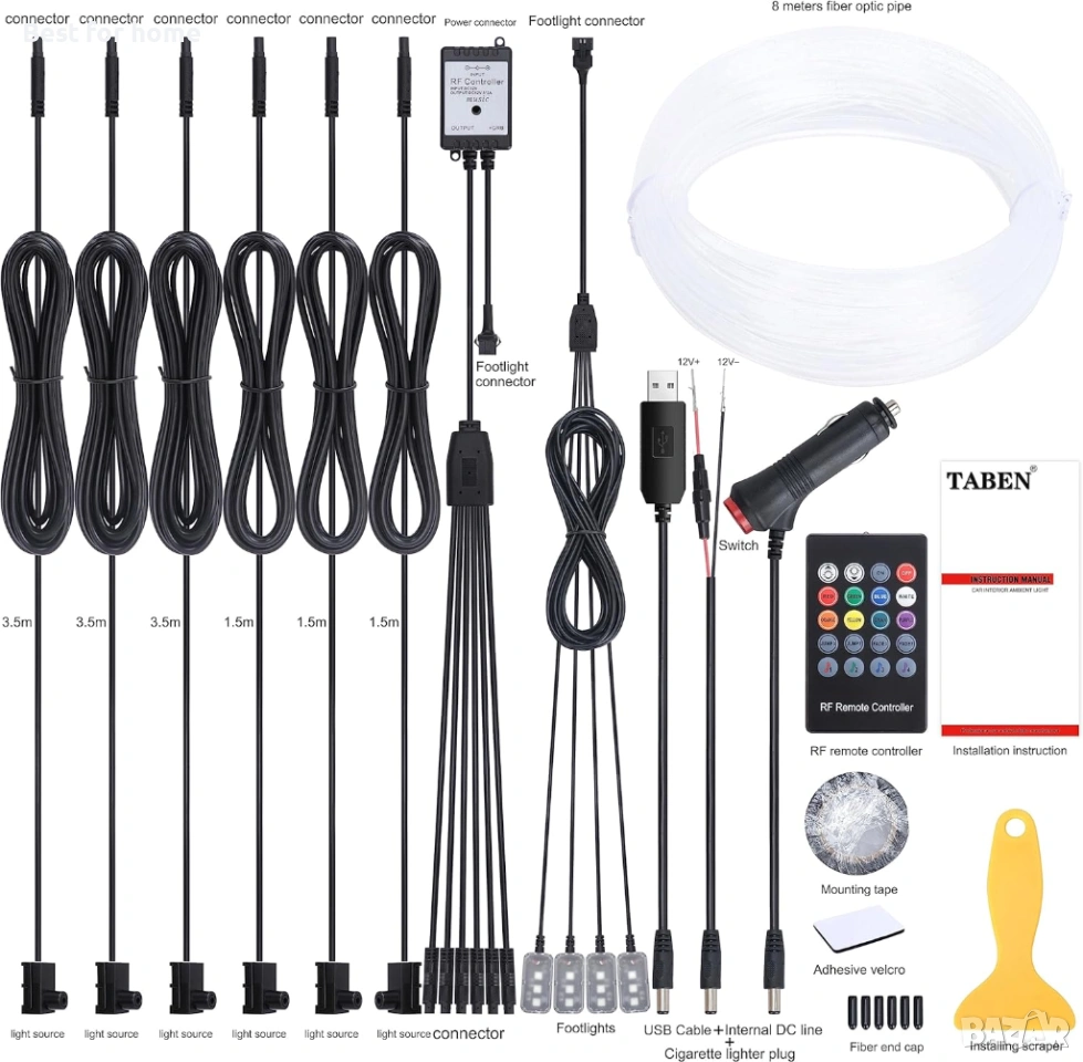 Комплект за амбиентно осветление за кола TABEN, 8 м оптично влакно, 64 цвята, RF дистанционно управл