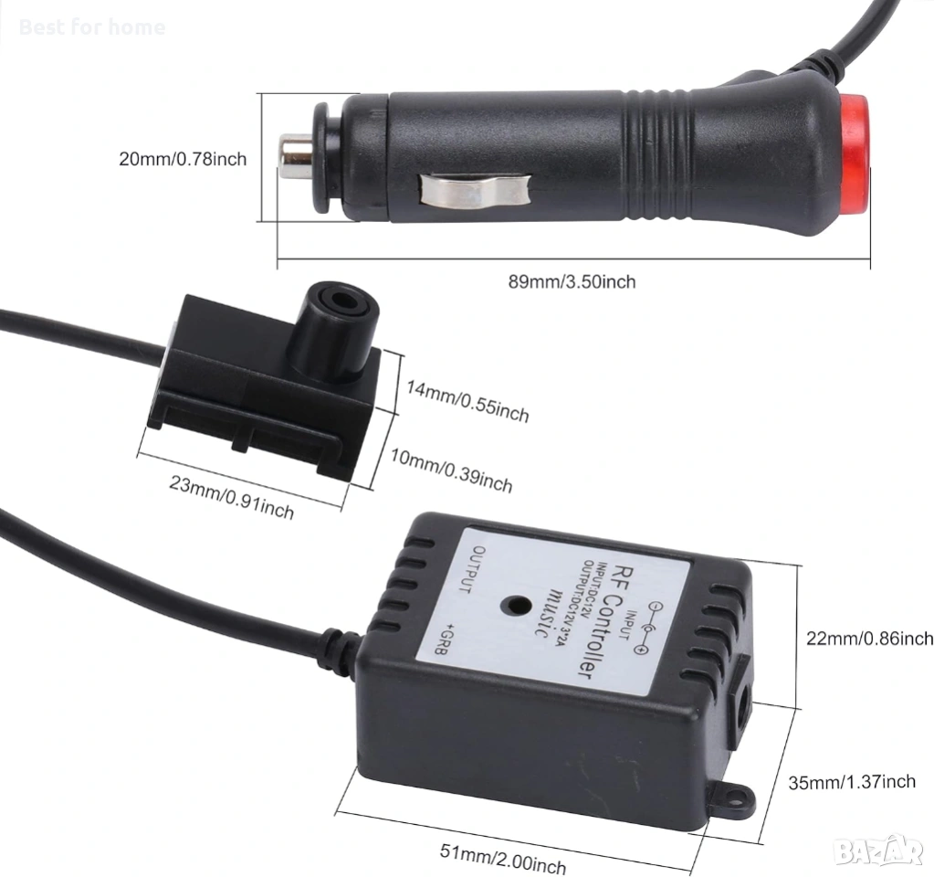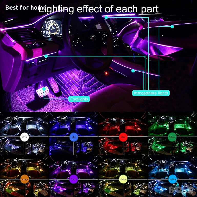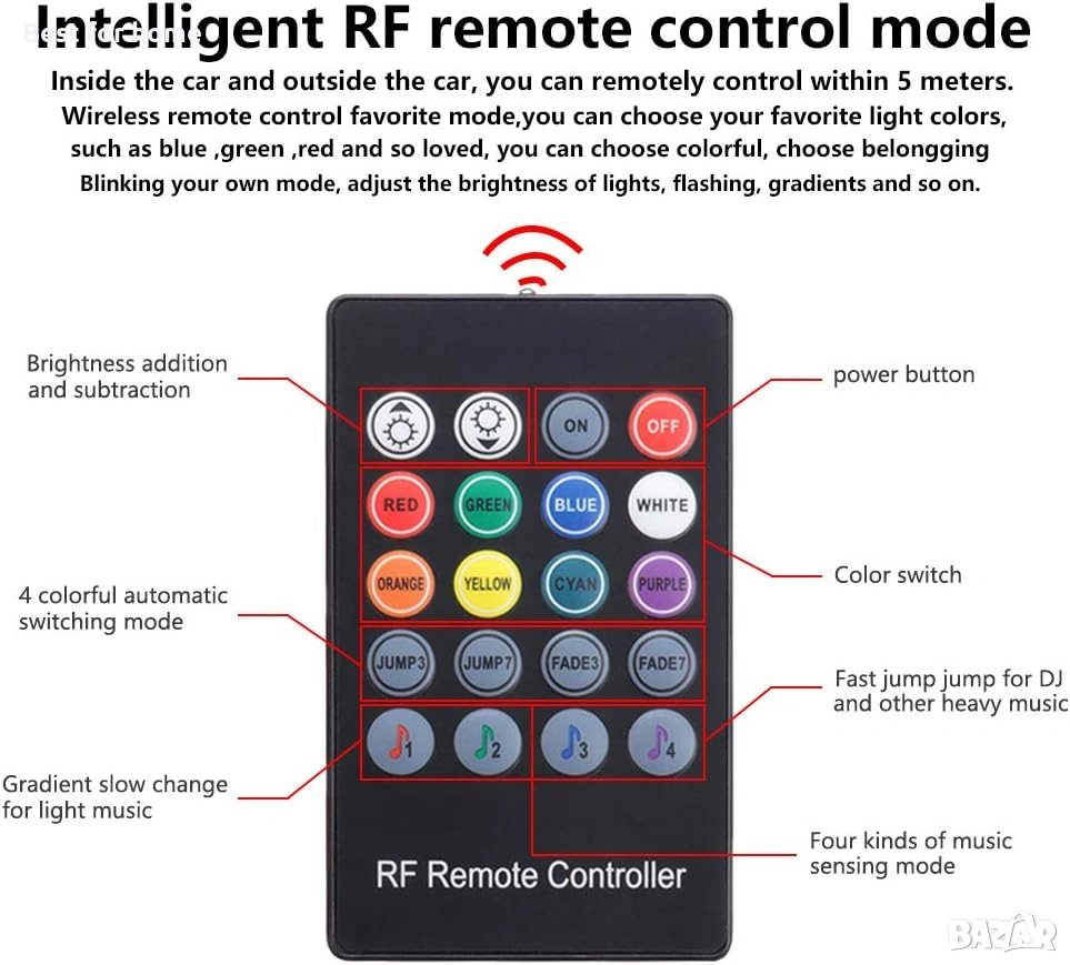【Комплект за амбиентно осветление за кола с RF дистанционно управление】 Чрез RF дистанционното управление можете да управлявате цветовете, яркостта и динамичния музикален режим на светлините с функция за памет. Ще се насладите на комфортно, романтично и жизнено изживяване при шофиране. С изходно напрежение 12V, няма нужда да променяте окабеляването, осигурява 3 метода за свързване към захранване: запалка, DC линия и USB кабел.