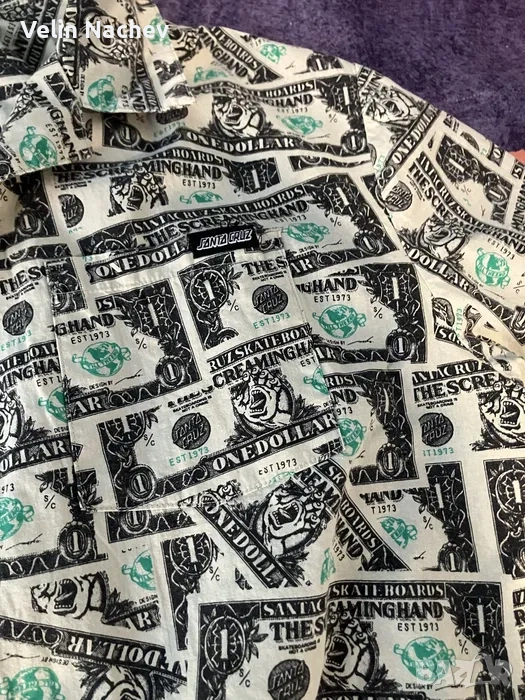 * Дизайн: Цялата риза е с щампа на доларови банкноти, което я прави много интересна и отличителна. Върху нея са изобразени и класически елементи на марката, като логото "Screaming Hand".