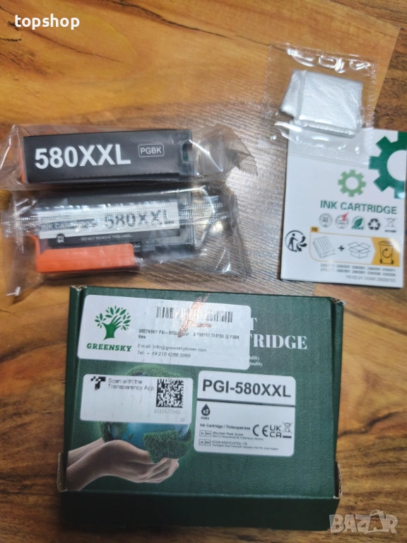 Описание Продавам два броя чисто нови, запечатани касети с черно пигментно мастило PGI-580XXL. Касетите са на марката Greensky и са висок клас съвместим консуматив с увеличен капацитет (XXL) за максимален брой страници.