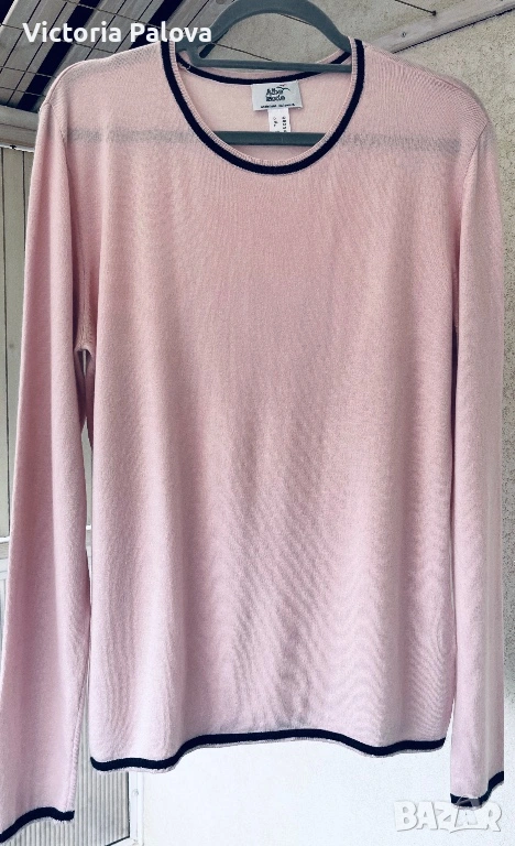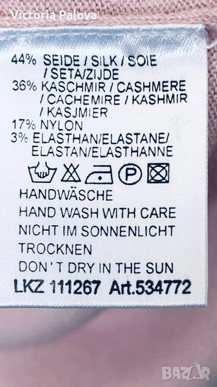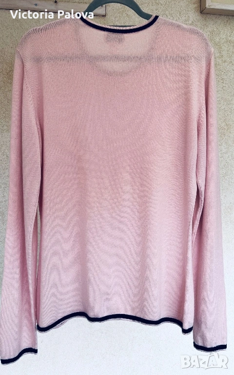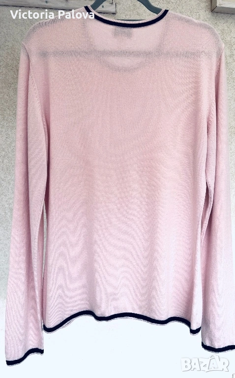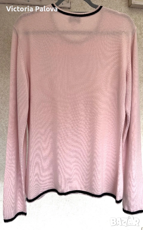 Нежна розова блуза, вдъхновена от италианска елегантност и луксозен комфорт. Съчетание на премиум материи : 44% коприна, 36% кашмир. Черните акценти по деколтето, маншетите и подгъва създават контраст, който добавя модерен чар. Тази блуза е вечен класически елемент, който носи стил и увереност в ежедневието. Рамо - 48см, ГО - 55см, дължина - 71см, ръкав - 70см.