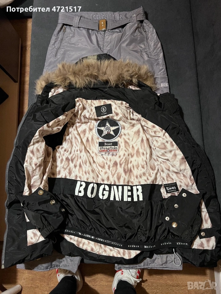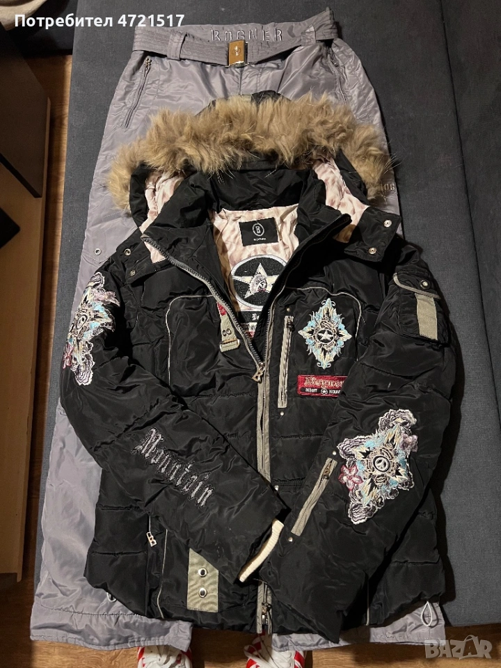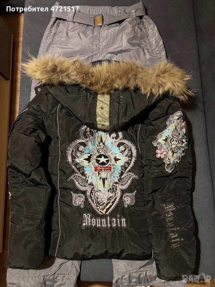 Продавам стилен и луксозен ски екип Bogner, размер 38/М, в елегантна черно-сива комбинация. Комплектът е с качулка с лисица, има нашивки цветя и е с логото на марката. Идеален за да покорите върховете, съчетавайки лукс и комфорт.
