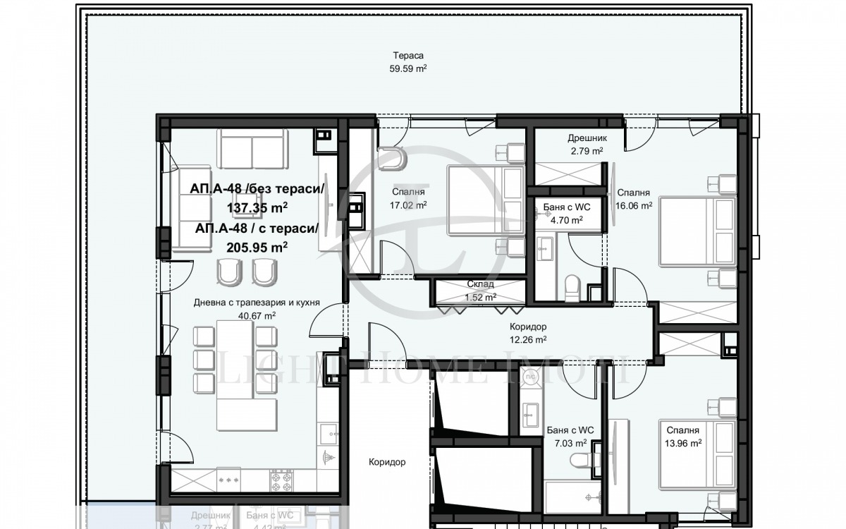 - Разпределение: Просторен и светъл хол с кухненски кът 41кв.м , три големи спални ,едната от които е със собствен санитарен възел и дрешник, входно антре,склад, баня и тоалетна и голяма панорамна тераса. Към апартамента има прилежащо избено помещение 3,19 кв.м