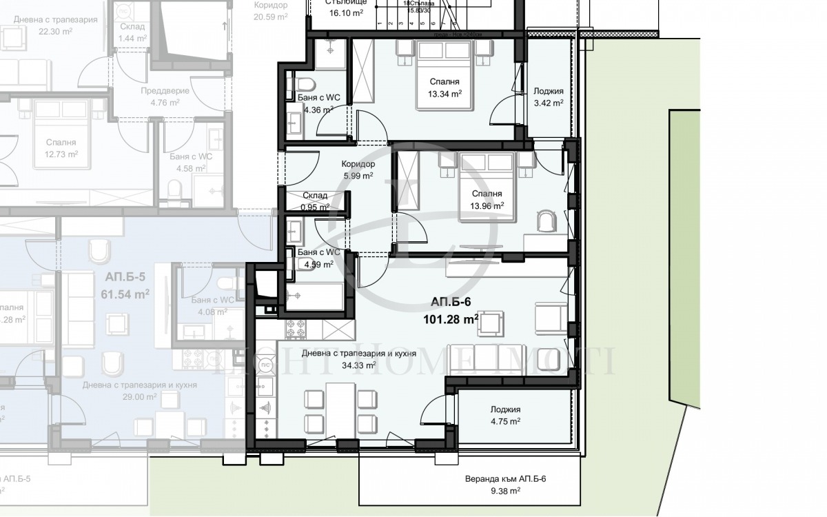 - Разпределение: Просторен и светъл хол с кухненски кът, две големи спални , входно антре, две бани с тоалетни и две лоджии и собсвена веранда 9,38кв.м. Към апартамента има прилежащо избено помещение 4,22кв.м