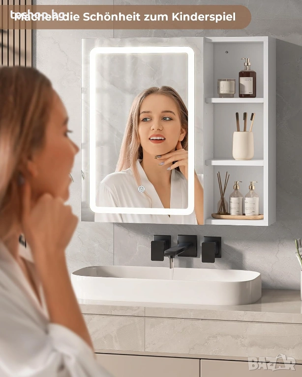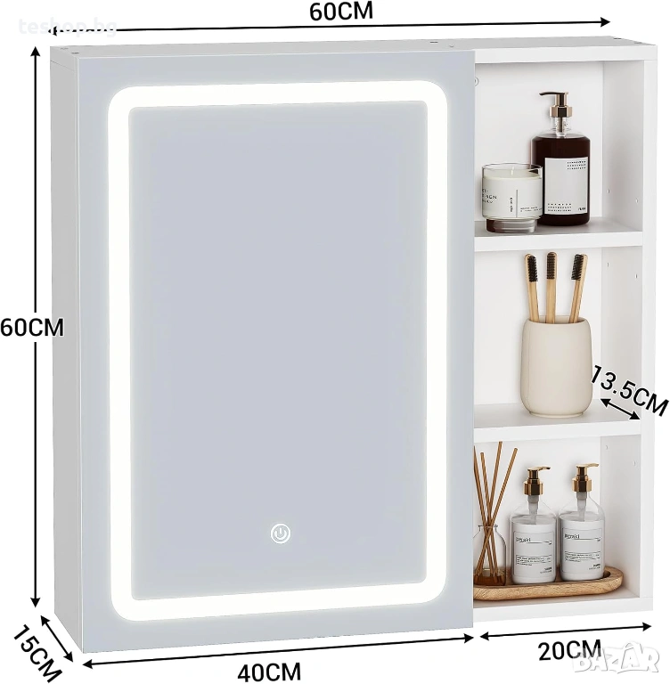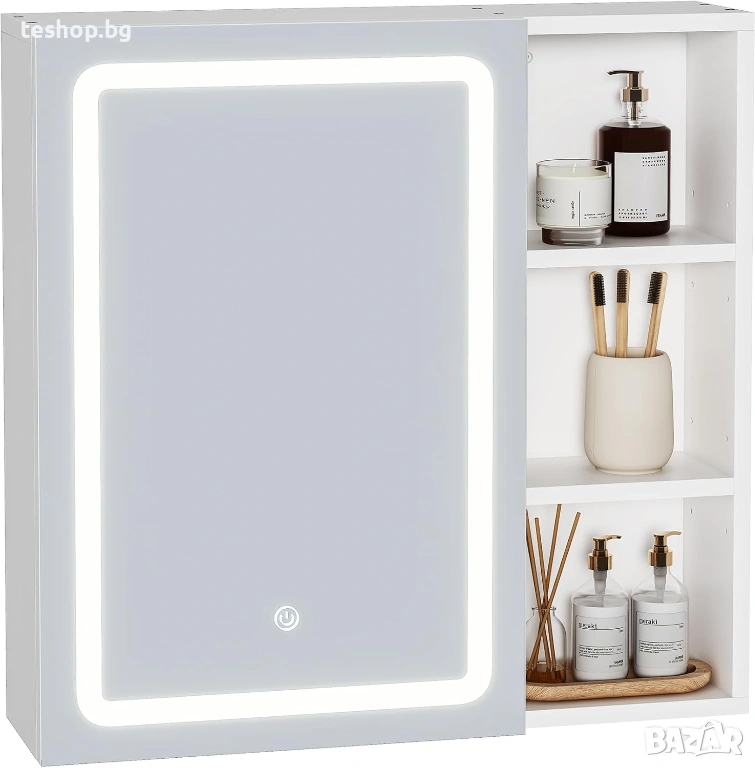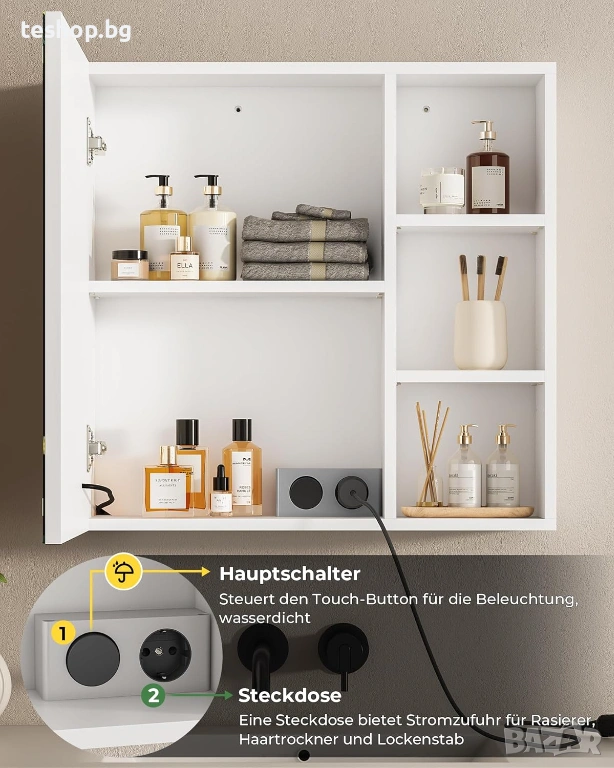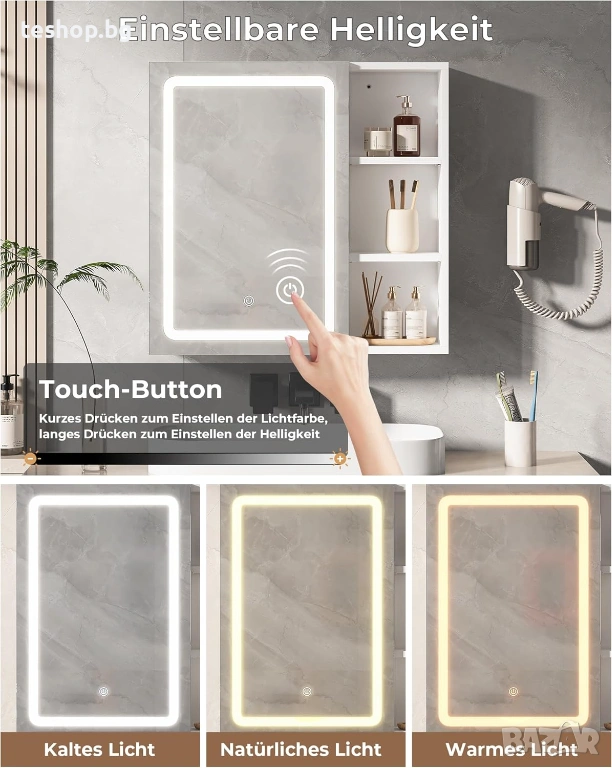 Огледалният шкаф е оборудван с ярко и равномерно LED осветление. Като натиснете кратко бутона за докосване, светлинният цвят (студено бяло, неутрално бяло, топло бяло) и като натиснете яркостта за дълго време. Гнездото в шкафа е водоустойчиво и устойчиво на влага и захранва самобръсначки, сешоари. А основният ключ до гнездото също може да контролира осветлението