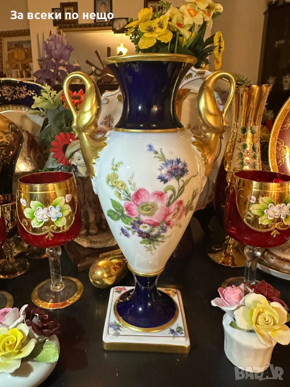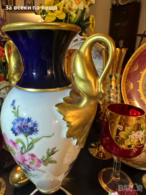 A. K. “Kaiser" Germany "Echt Scharffeuer Kobalt" “Изящната ваза” дръжки от злато с форма на лебеди, височина 24 см и с определено невероятна красота в злато и кобалт, блясък и уникална технология на изпичане и производство, it’s a specific high-temperature cobalt firing process.