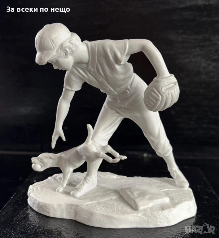 Franklin Porcelain Bavaria Germany автор световно известният художник Norman Rockwell Circa 1978 с име “ В играта сме”! великолепна, рядка и лимитирана фигура на юноша в игра задно с домашния си любимец с височина около 15 см, немска прецизност и класа, очарователно фирми и движения на персонажа, блестящ порцелан, уникален художник, богатство и уникална красота за всеки ценител, отлично качество и състояние.