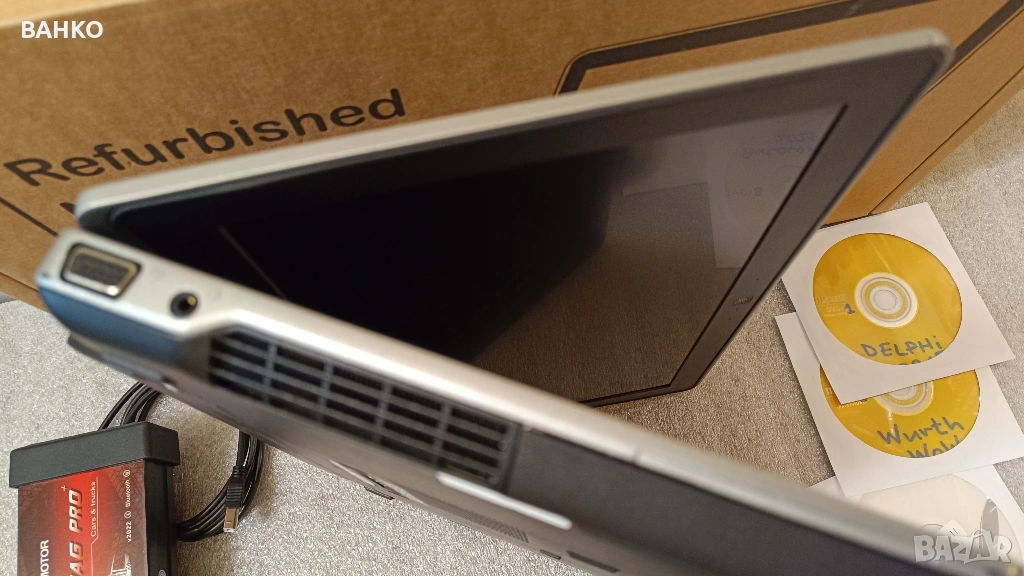 ревизиран лаптоп DEL втора употреба с инсталирани програми на български език. Трябва само да свържете диагностиката към автомобила и може да започвате да работите.