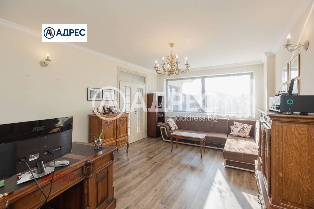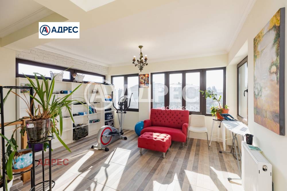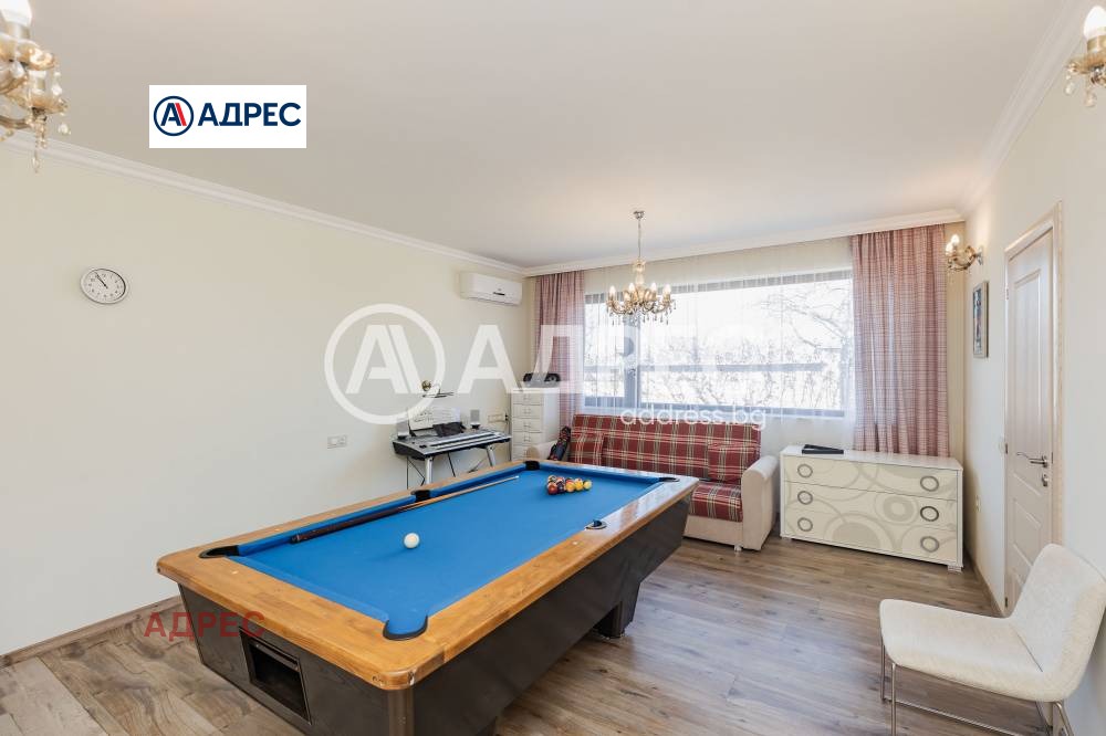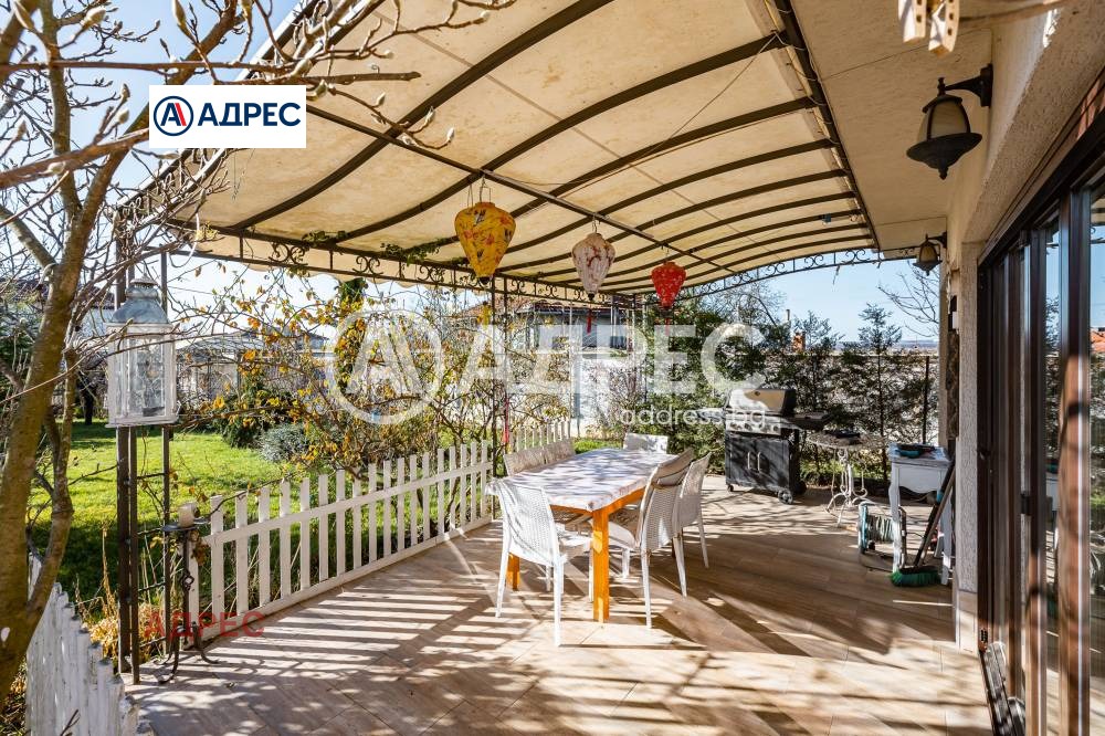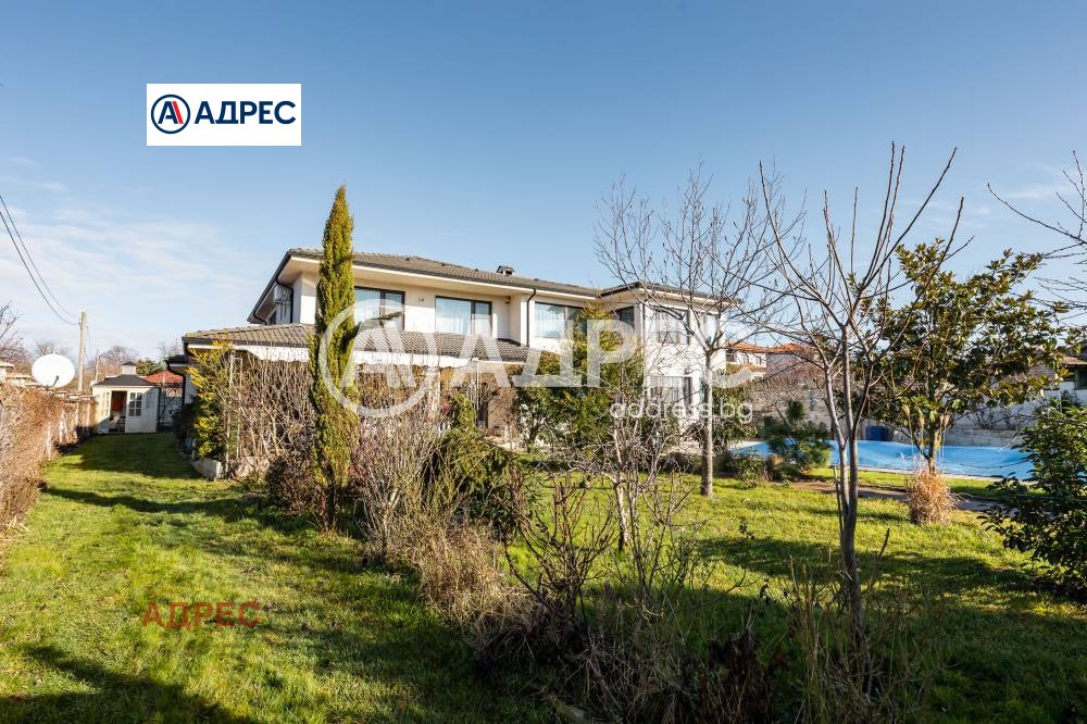 Еднофамилна, двуетажна къща със ЗП - 235 кв.м и РЗП - 400 кв.м, разположена в парцел с площ 1100 кв.м. Къщата се състои на 1 во ниво от дневна, в центъра на която има камина от естествен какмък, кухня с трапезария, бильярдна зала, баня с тоалет, парна баня също с тоалет, коридор, лятна кухня 36 кв.м, подземна маза и стълбище към 2 ро ниво. На 2 етаж има три спални, всяка с дрешник и баня с тоалет, офис - кабинет, фитнес зала и перално помещение. В дворното пространство, много добре озеленено и поддържано има над 50 вида рози от Англия, плодови дърветата (вишнап, круша, яблъка, череша, райска яблъка, асми с грозде), автоматична поливна система с наличие на два резервоара по 7 м3 за полив и хидрофор. Има басейн с термопомпа 5х8 м, 70 кубика солена вода, електролизер и УВ лампа. Навес за паркиране, голяма порта с GSM модем и ел. двигател, просторна тераса с маркиза и BBQ. В двора има склад за градинарски инструменти и работилница.