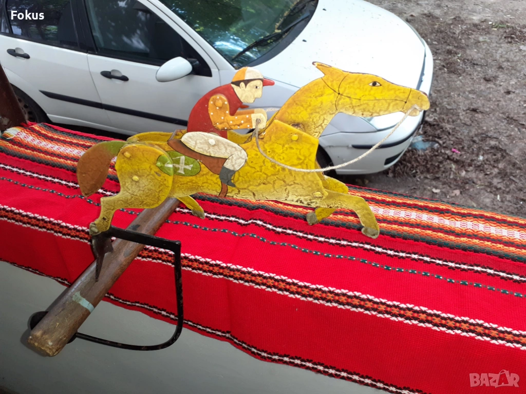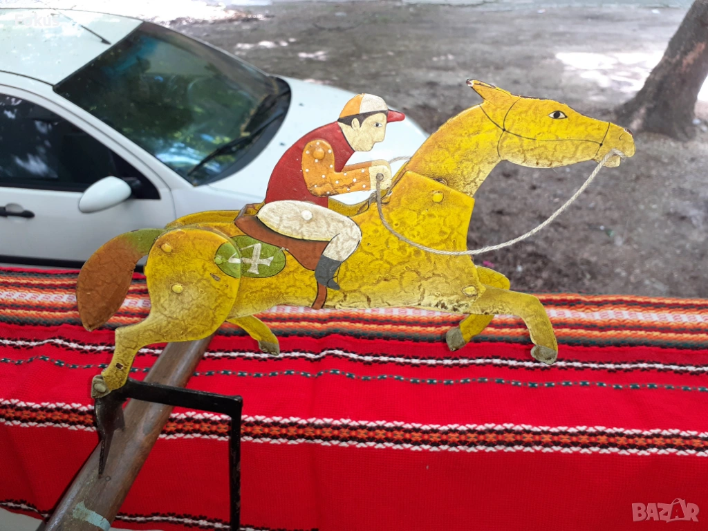 Като се залюлее махалото, жокея и коня стават като живи, започват да се движат имитирайки езда. Липсва стойката.