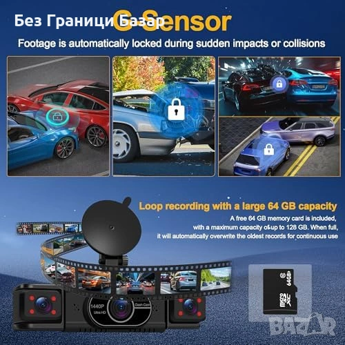 Цикличен запис и включена microSD карта 64 GB (поддръжка до 128 GB)