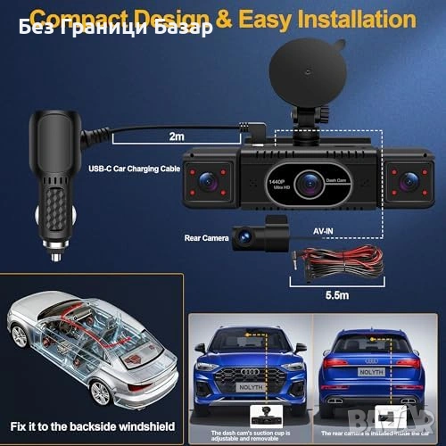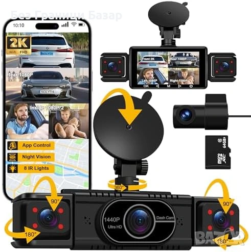 Нов Dash Cam Автомобилна камера 360° 4 канала 2K WiFi 8 IR лампи 64GB карта