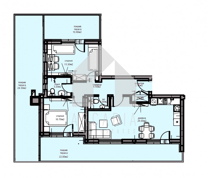 Предлагаме Ви за продажба ТРИСТАЙНО жилище с функционално разпределение - слънчева дневна с кухненски бокс, две спални, баня с тоалетна, втора тоалетна, входно антре, просторни тераси , склад.
