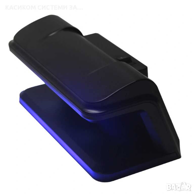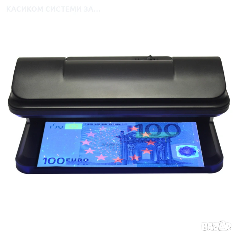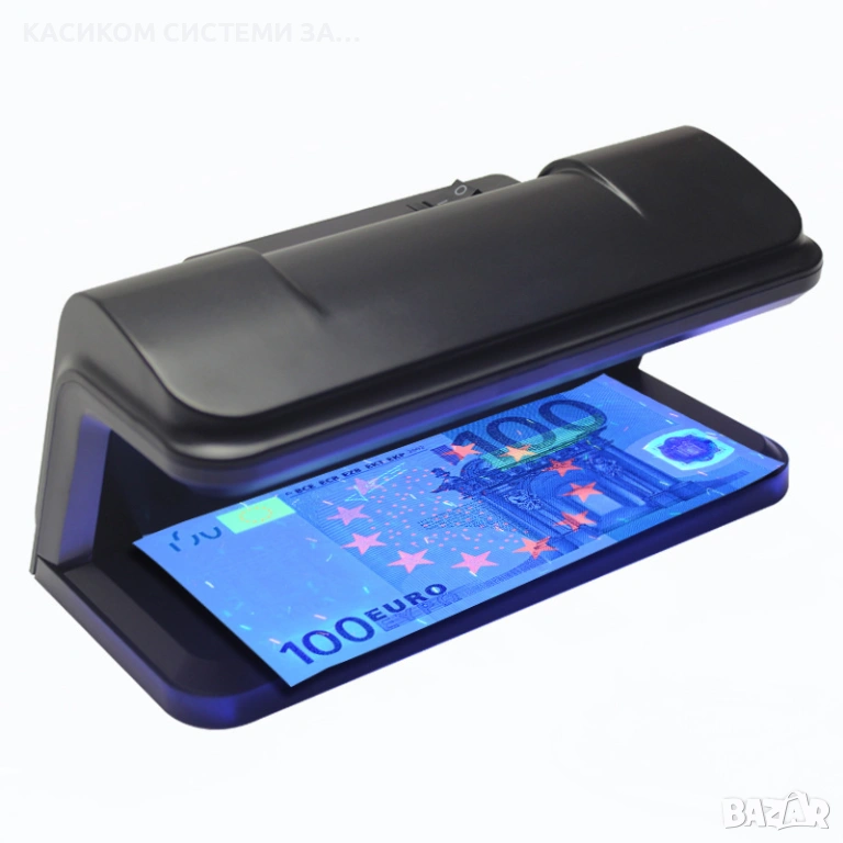* Уредът ясно различава истински от фалшиви банкноти — при оригинална банкнота се виждат само специфични защитни елементи, докато при фалшива свети цялата повърхност.