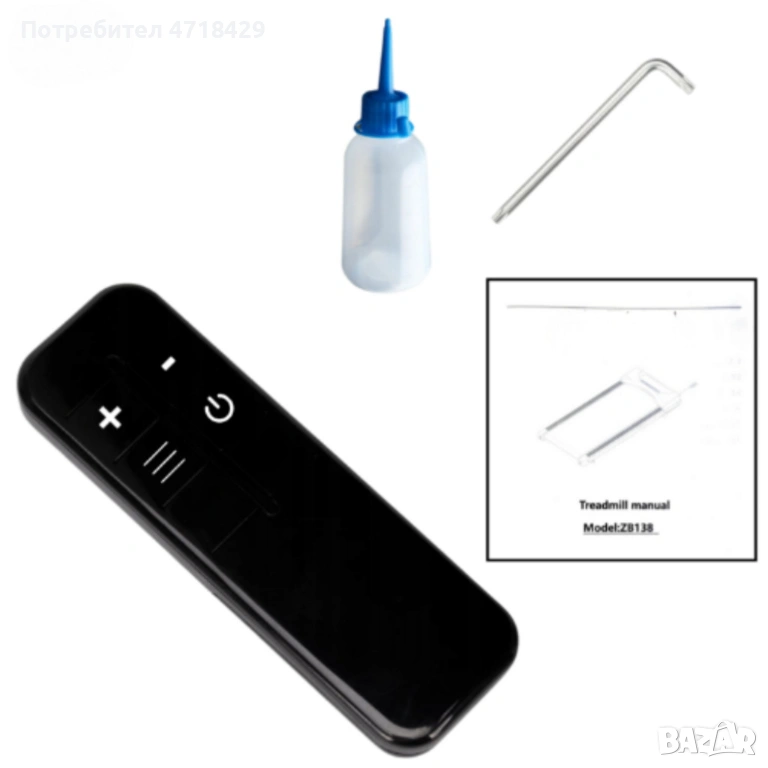 Комплект: пътека, дистанционно, шестостенен ключ, смазочно масло, ръководство.