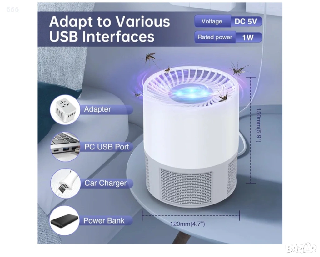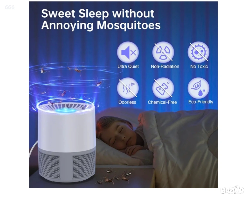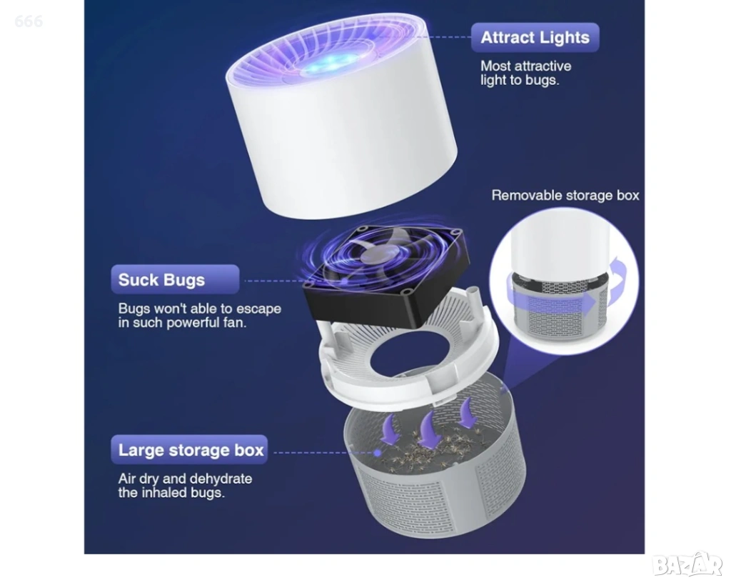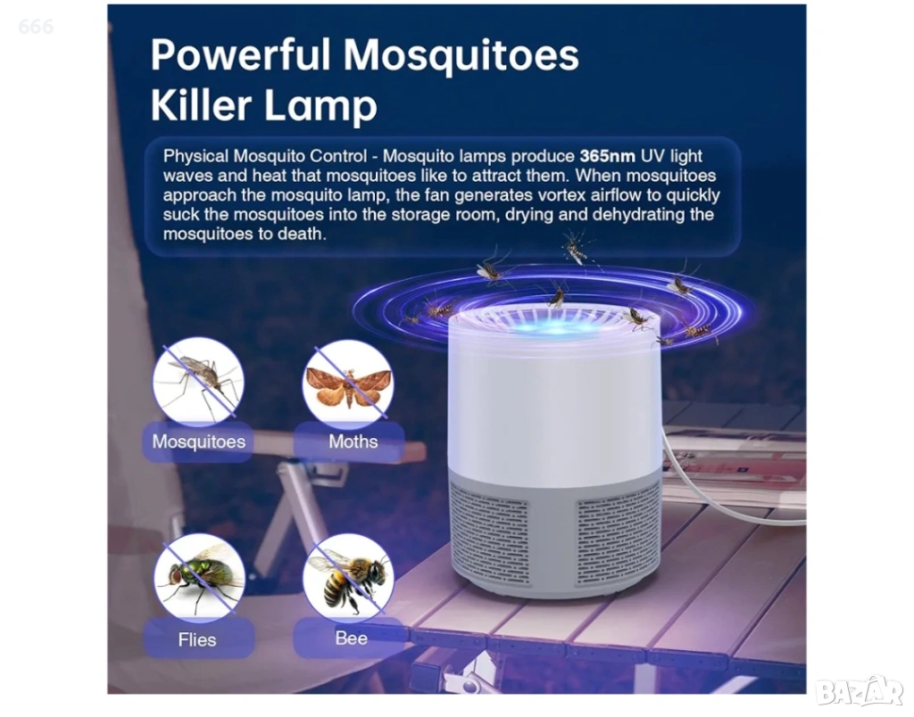 Лампата за комари не само убива комари, но и улавя други досадни насекоми като мухи, плодови мушици, молци и комари и др.