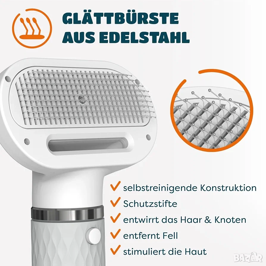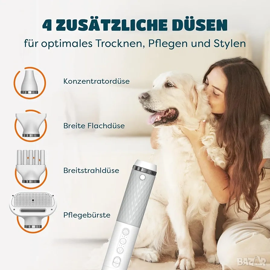 * Мултифункционални приставки: Включва специализирана четка от неръждаема стомана със самопочистващ механизъм и защитни върхове, която ефективно отстранява падналата козина и разплита възли, както и три допълнителни дюзи за насочване на въздушния поток.