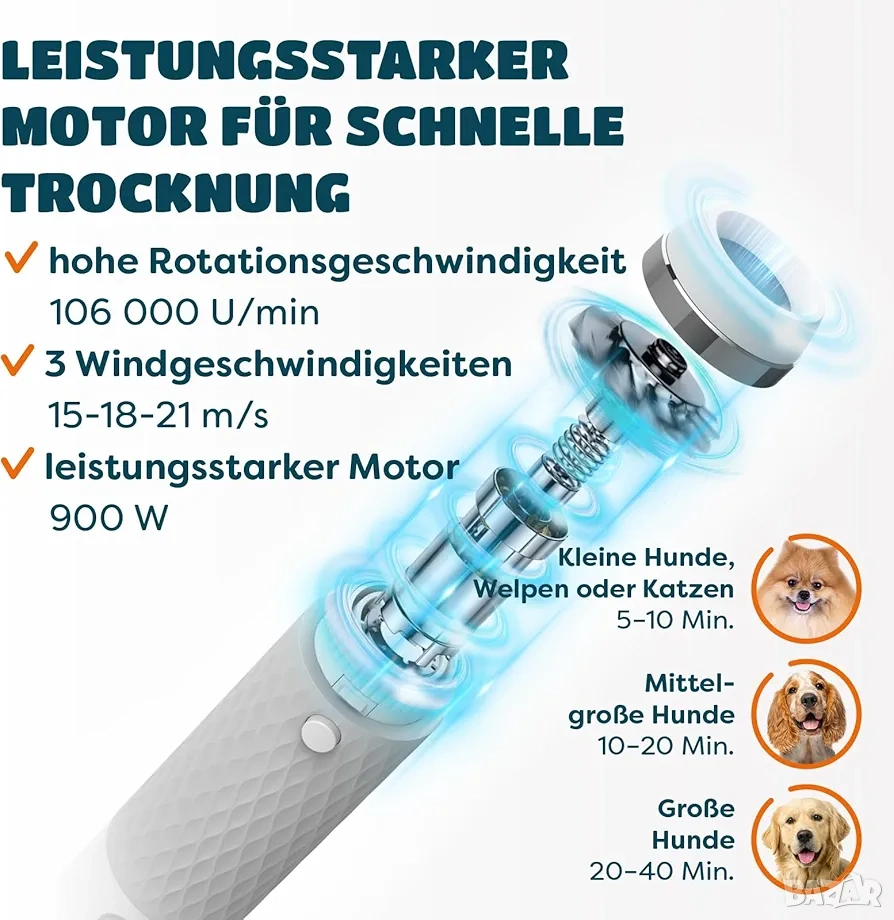 * Мощен безчетков мотор: Оборудван с 900W мотор, достигащ до 106 000 оборота в минута, уредът осигурява силна въздушна струя за бързо и ефективно сушене (приблизително 5-10 мин. за малки породи и 20-40 мин. за големи породи).