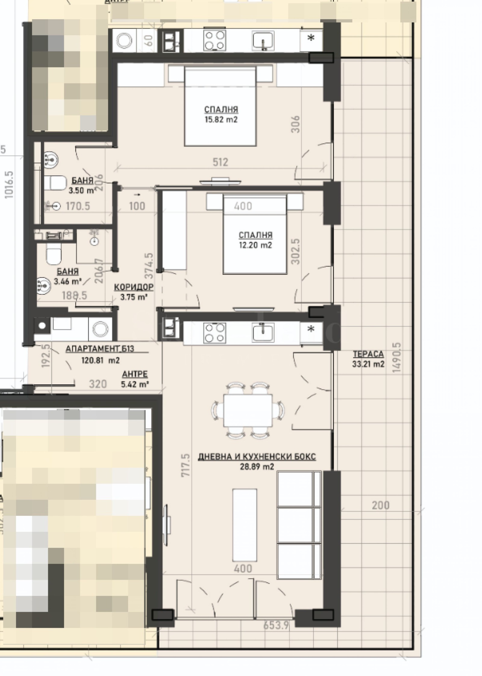 Тристайният апартамент е разположен на 3-ти етаж в сграда Б и има обща площ 136.53 кв.м, чиста площ 120.81 кв.м. Изложението му е благоприятно - юг/изток.
