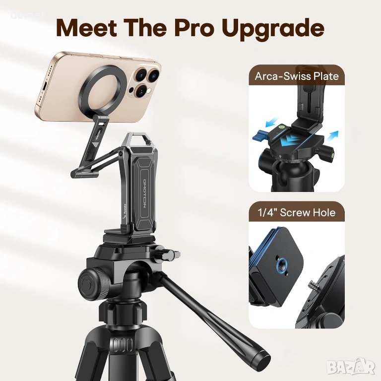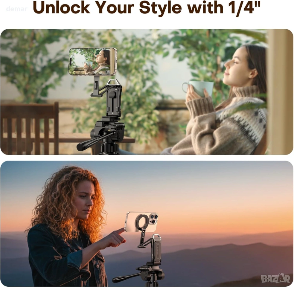 Този компактен магнитен статив за телефон използва мощни N52 магнити за незабавно и сигурно закрепване и стабилна противоплъзгаща скоба, предотвратяваща движение или вибрации. Поддържа 360° въртене с обширно многоосно регулиране за гъвкаво портретно или пейзажно снимане и включва както 1/4" отвор за винт, така и Arca-Swiss съвместимост за бърз монтаж на стандартни стативи. Дизайнът позволява лесно превключване между ръчен, стативен и магнитен режим на монтаж, разтяга се за различни настройки на снимане и се закрепва към метални повърхности за употреба без ръце. Изработен от издръжлива алуминиева сплав, той се сгъва за преносимост и пътуване, като широката съвместимост обхваща модели iPhone, калъфи MagSafe и устройства с Android чрез включения магнитен пръстен.
