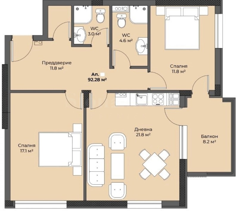 две спални - 17.10 кв.м и 11.80 кв.м;