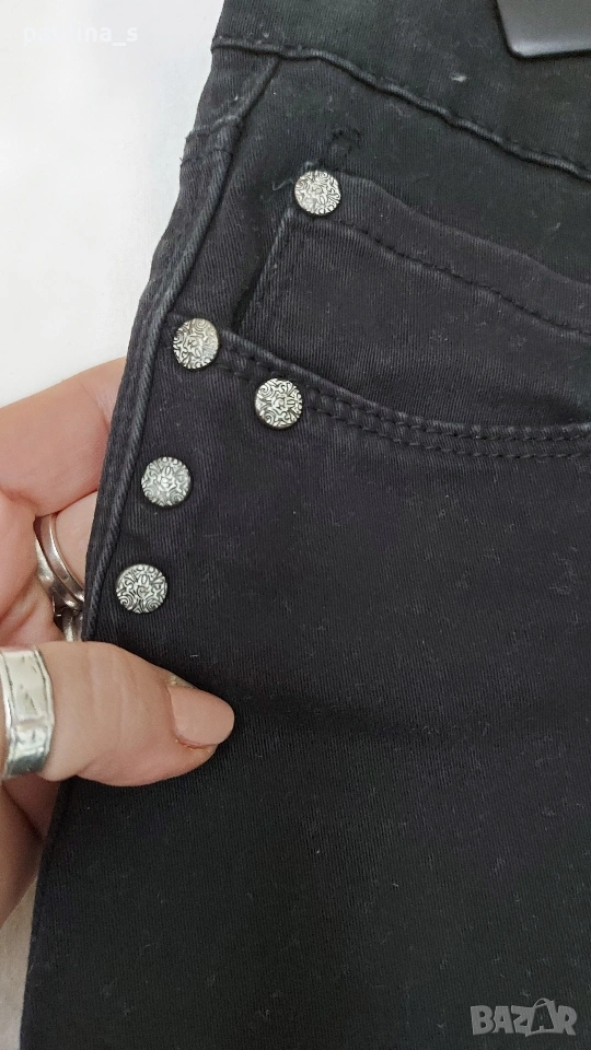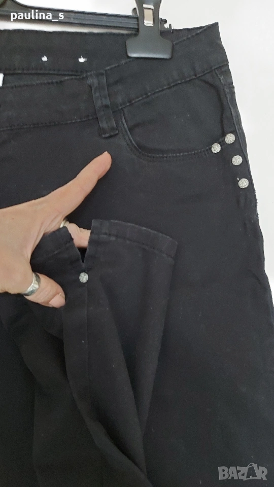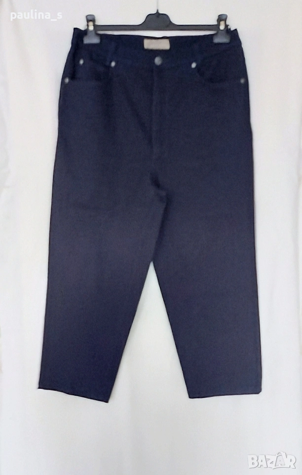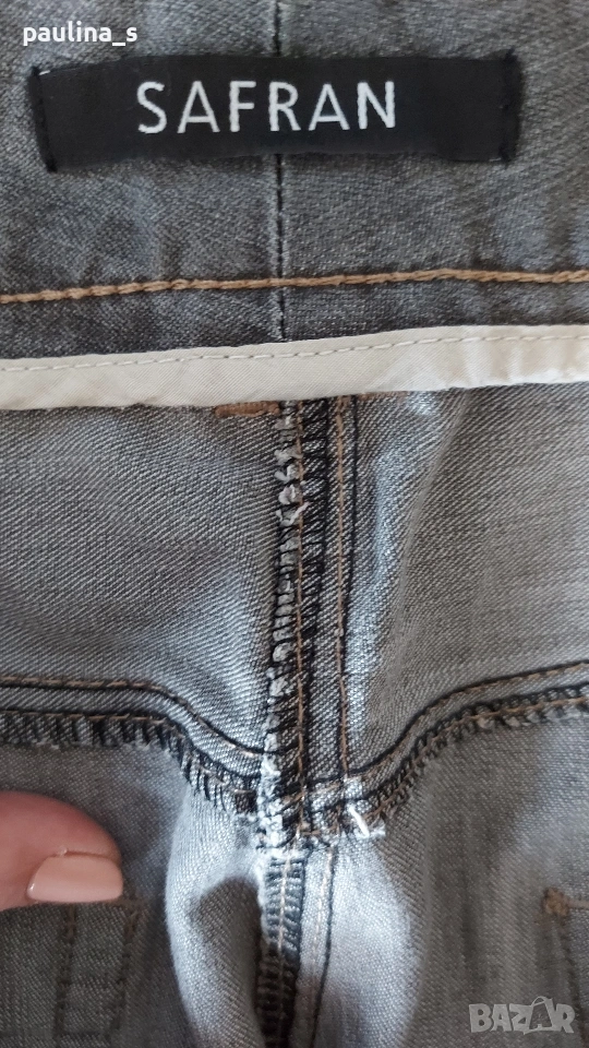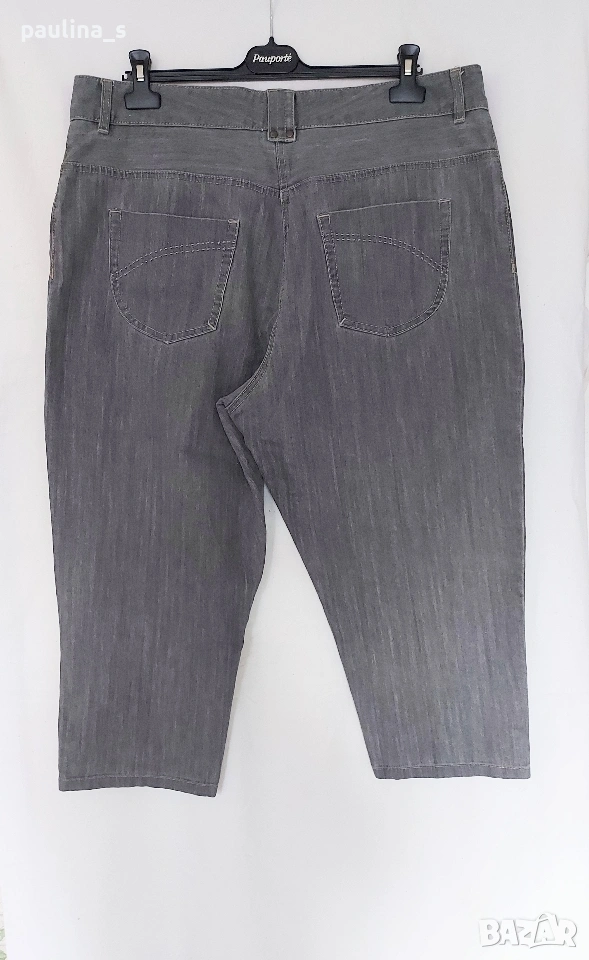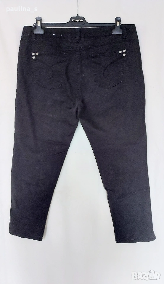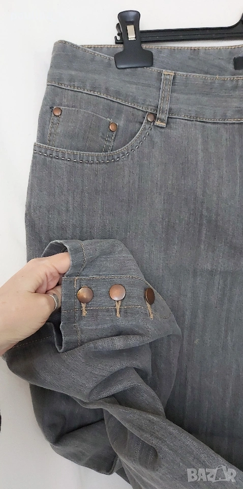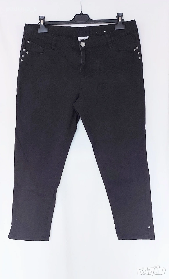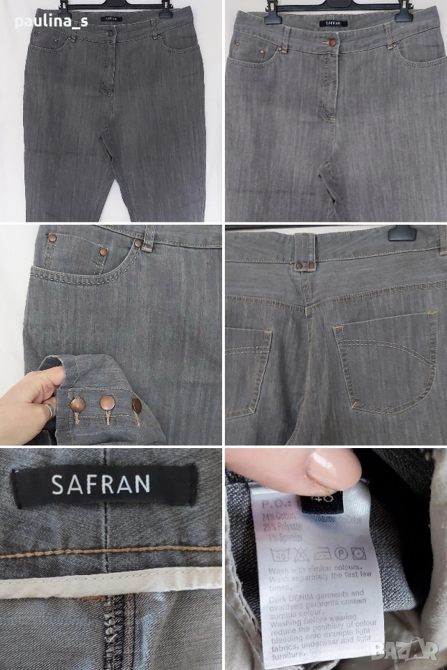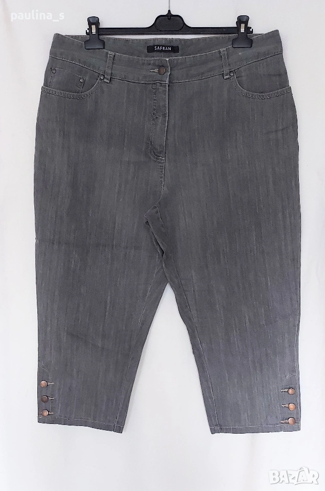 2️⃣. 2XL / 3XL (48EU) - "Safran". Цената е крайна, без пазарлъци 20 евро. Маркови еластични дънки с дължина 7/8. Крачолите са с копчета и ефективни цепки в страни, брандирани, с оксидирани кабси, бежови тегели презбод. Моделът е 5 pocket Denim. Без дефекти и етикет, като нови, голям размер.