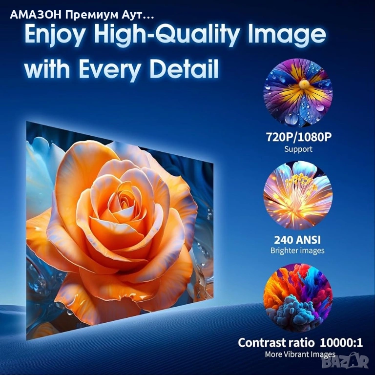 - Поддръжка на 4K, 1080P и 720P: Новата LCD прожекционна технология на проектора подобрява контраста на екрана и точността на цветовете, а HDR предоставя по-богати и по-реалистични изображения, като заснема, създава и показва по-широк диапазон от нива на яркост и дълбочина на цветовете. Проекторът е идеален за гледане на филми и снимки. Проекторът поддържа възпроизвеждане на видео във формати 4K, 1080P и 720P.