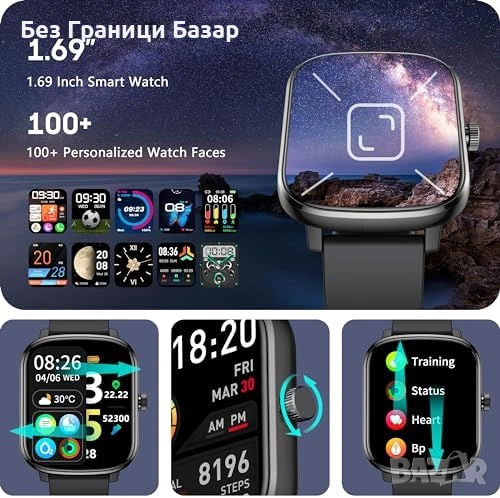 Нов Смарт Часовник 1.69'' 100+ Спортни Режима IP67 Fitness Smartwatch С Пулс Кислород Кръвно iOS