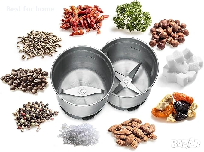 Лесен за поддръжка корпус от неръждаема стомана, мощен мотор, тиха работа, лесен за употреба: Контрол на времето на стъпки от 5 секунди от 5-30 секунди, 3-степенен контрол на скоростта, импулсна функция за ръчна работа, безопасна работа: Работа е възможна само с поставен капак на кутията, безопасно изключване при отваряне на капака на кутията, 4 силиконови крачета за неплъзгаща се стойка, прозрачен, подвижен капак на корпуса, подвижни части, подходящи за съдомиялна машина. Включва: 2 висококачествени контейнера от неръждаема стомана, всеки с прозрачен капак: Контейнер за смилане с ударен нож с 2 остриета, универсален контейнер със специален нож с 4 остриета, спойка за кафе с вградена четка за почистване