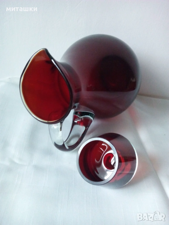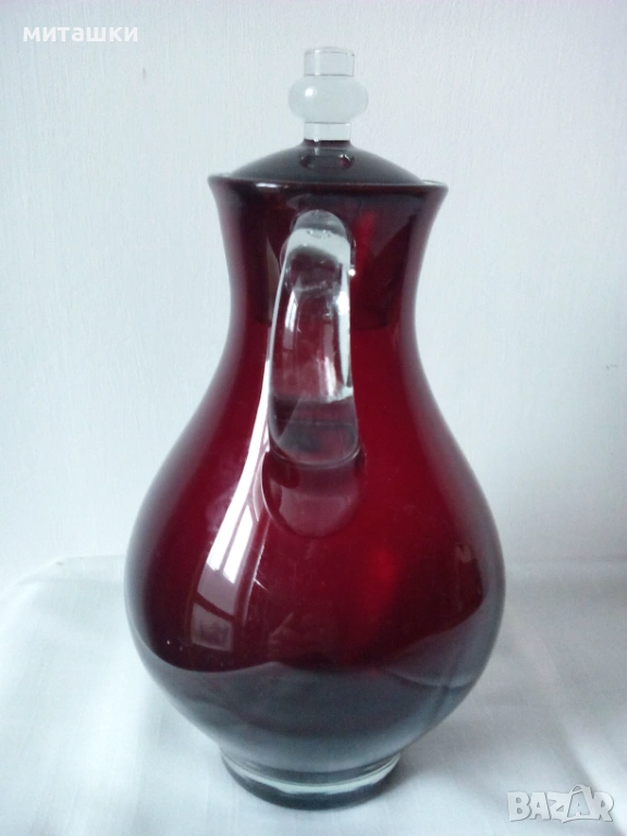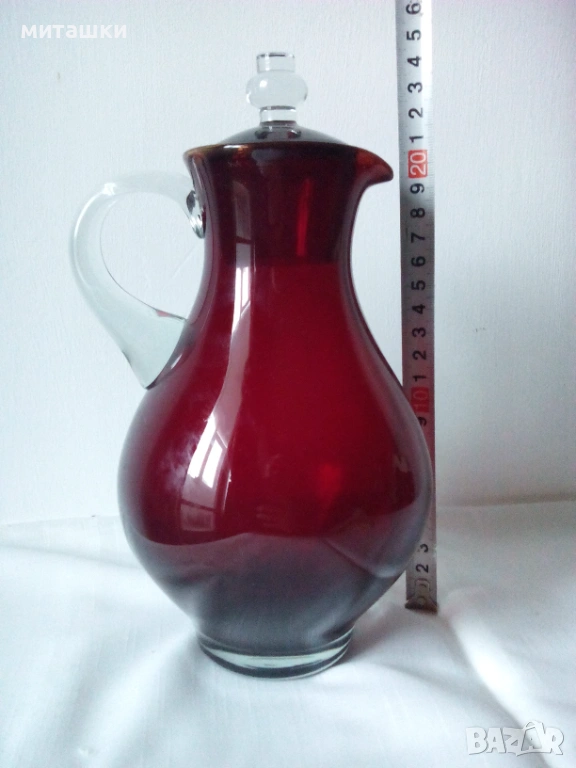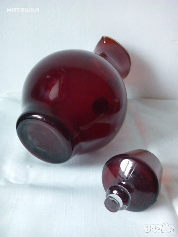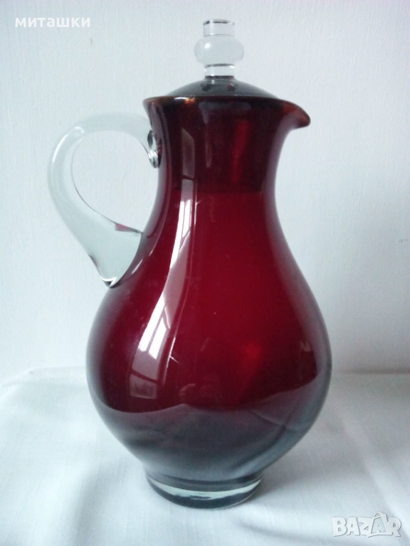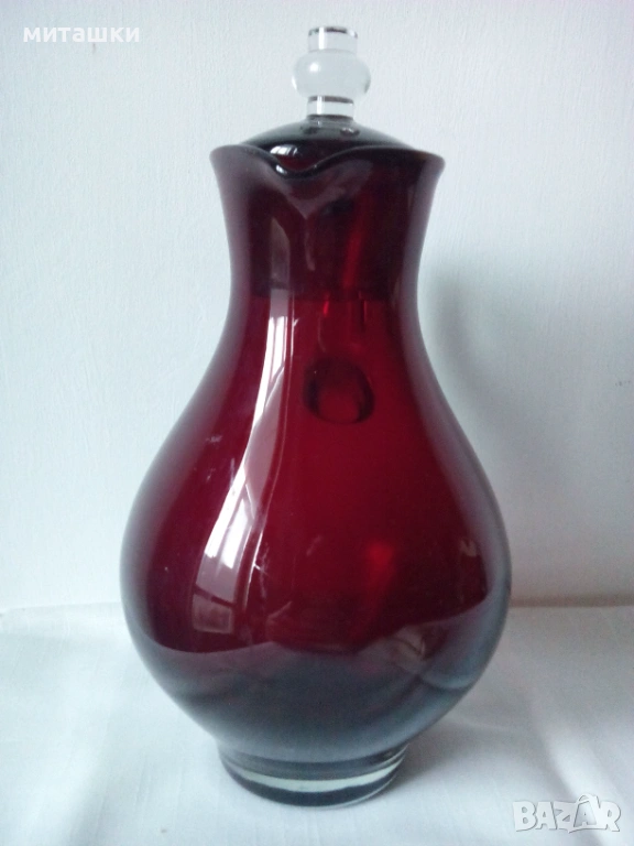 Изящна вишнева кана със плътна запушалка , тегло 1 кг , вместимост 1 литър , височина 24 см , без забележки .