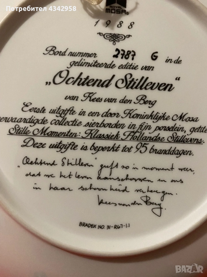 Колекционерска декоративна порцеланова чиния – Royal Mosa, 1988 г.