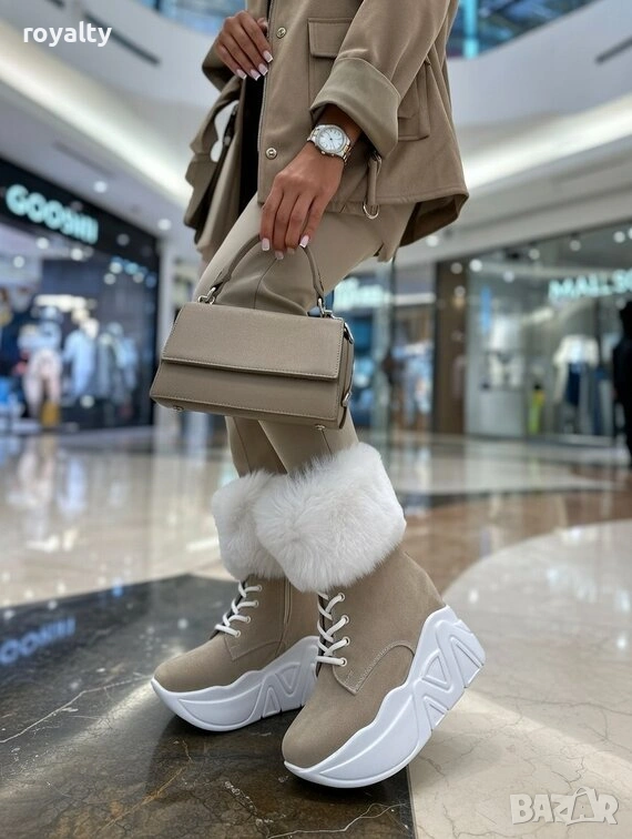 Боти на платформа - бежов велур с бял пух и бяло ходило → Обява 53282599