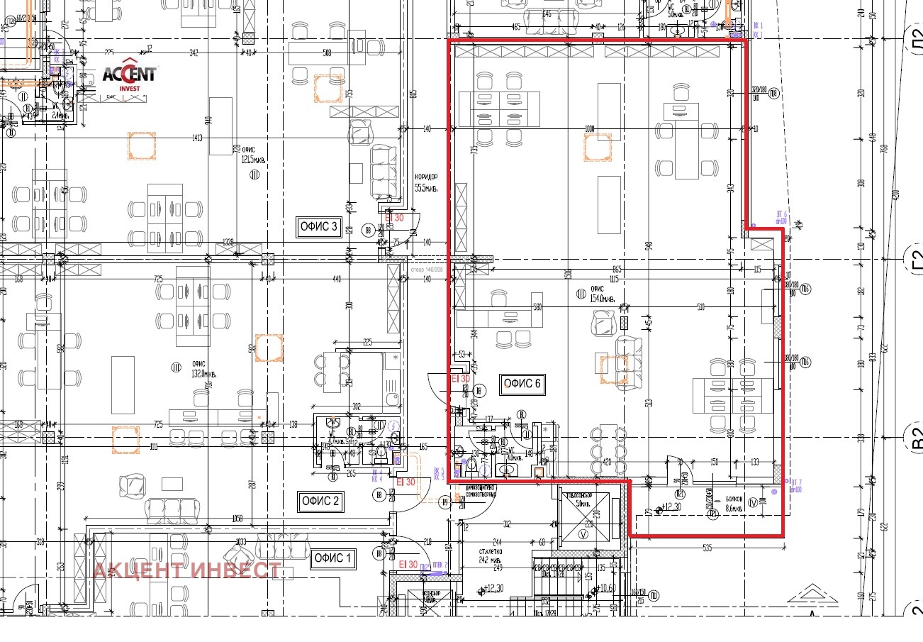 KOD 21579 'Акцент Инвест' Ви предлага офис помещение за продажба в кв. 'Възраждане' 4. Имотът е с обща площ от 233 кв.м. и се състои от едно оупън-спейс помещение и санитарен възел с предверие. Към имотът има включени две паркоместа в цената, с площ от 26 кв.м. Сградата ще бъде изградена от стоманобетонна конструкция и сандвич панели. Очаква се да бъде започната март месец 2026-та година, като срокът на изпълнение е 18 месеца от датата на започване. Офисът ще бъде завършен по БДС. Посочената цена е без включен ДДС. В сградата се продават още 5 офиса, като има възможност за обединение с някой от тях.