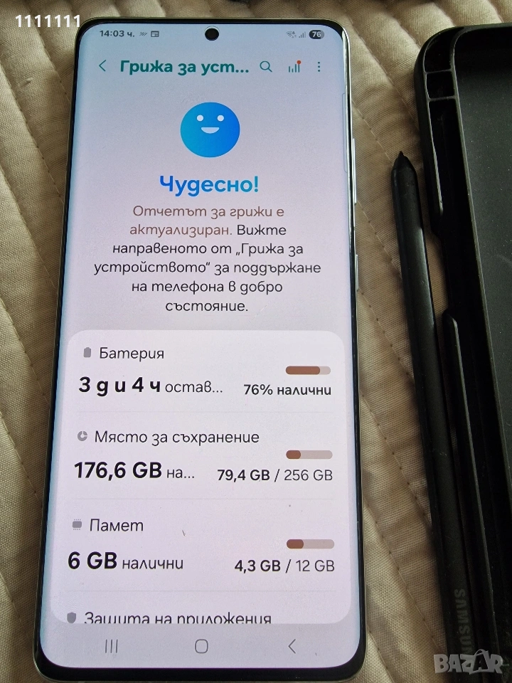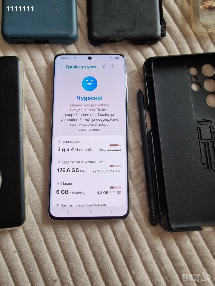 Телефонът е в отлично здраве и без каквито и да е козметични забележки. Има протектори на екрана и на гърба. Освен това, към телефона предлагам седем калъфа и оригинална писалка на Samsung. Два от калъфите са с място за писалка, но единият от тях е повреден.