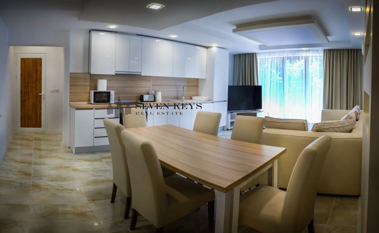 Апартаментът е с изцяло южно изложение и се състои от просторна всекидневна с кухненски бокс, две спални, две санитарни помещения, тераса.