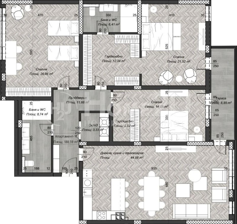 входно антре, хол + кухненски бокс 44,88кв.м., три спални (едната тип енсюит + гардеробно), още една баня + тоалетна, склад, тераса 8,85кв.м.