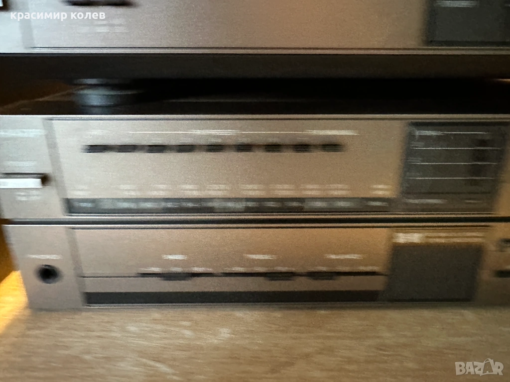 Всичко функционира , с изключение на единия канал на ресивъра , който не свири в норми.Грамофонът е с тангенциално рамо.Цената е за целия комплект.