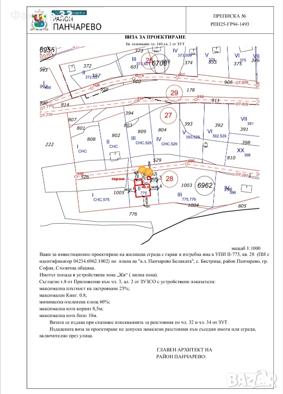 ИЗКЛЮЧИТЕЛЕН парцел с ВИЗА за проектиране и целогодишен достъп в с.Бистрица, район Панчарево, в.з. 'Беликата'. Площ - 1100 кв.м, УПИ- в регулация, ток и вода от водопровод- в имота. Визата предвижда 2 петна за 2 еднофамилни къщи. Устройствена зона Жв с параметри на застрояване: плътност на застрояване 25%, кинт 0,8, кота корниз- 8,5 м, кота било- 10м, мин.озеленяване 60%. Парцелът е на границата на Бистрица и Панчарево, в близост до финландските къщи. Идеален за 2 еднофамилни къщи. Илиева