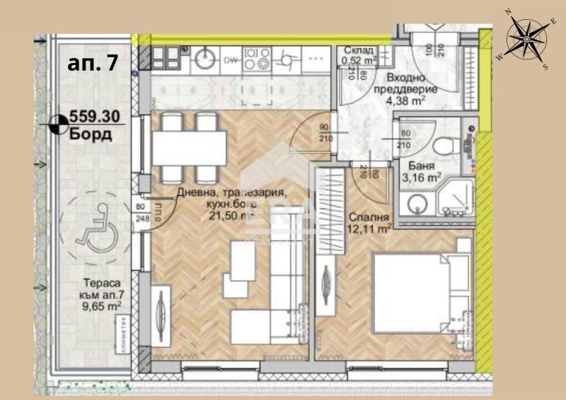 Разпределение - апартаментът разполага с входно антре, дневна с кухненски бокс, една спалня, баня с тоалетна и тераса със северозападен изглед.