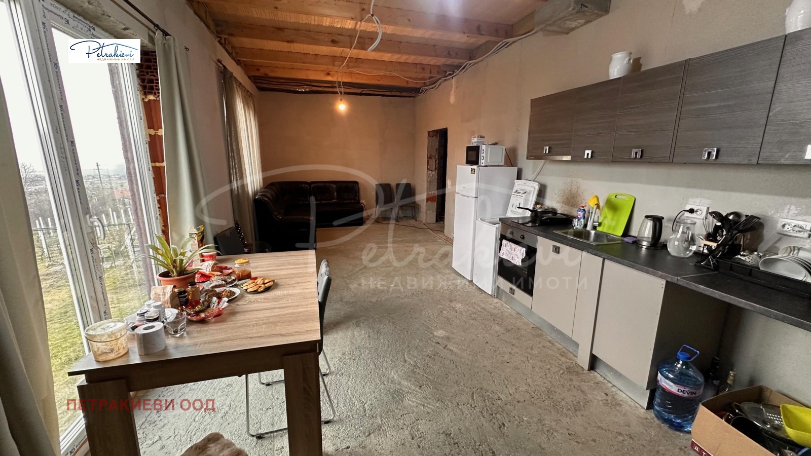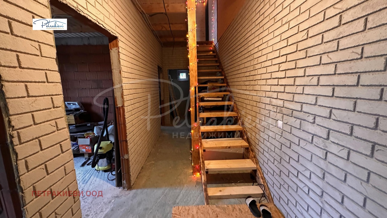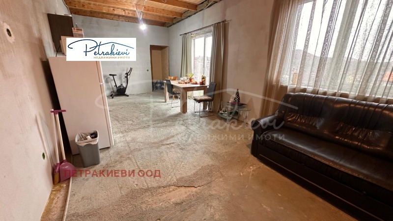 Двуетажна къща е напълно завършена отвън. Първият етаж е на тапа, с обособена всекидневна, в която има поставена кухня, диван, трапезна зона и осветление идеална основа за довършване според предпочитанията на новите собственици. Спалните на етажа са на тапа.