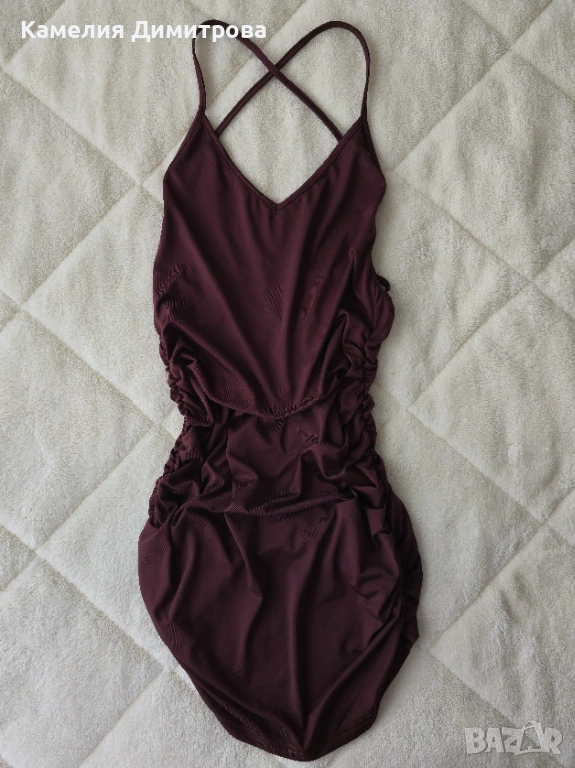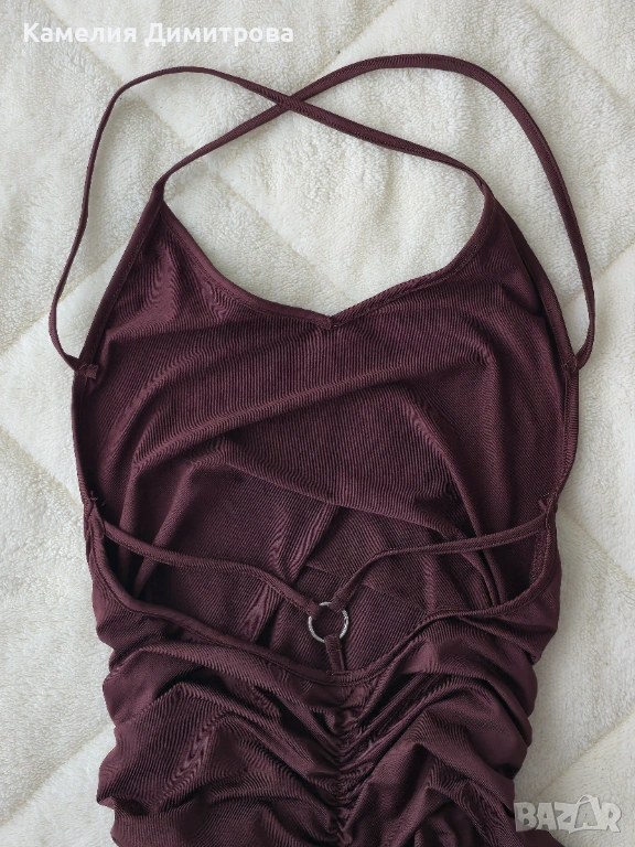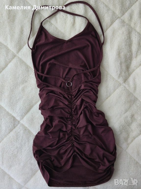 Стилна и много женствена рокля в наситен тъмнокафяв цвят, който стои топло и елегантно. Моделът е с интересен гръб, тънки кръстосани презрамки и красиво V-образно деколте, което подчертава горната част на тялото.