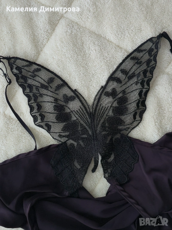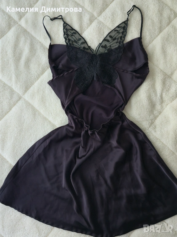 Стилна черна рокля с фина, женствена визия и много красив детайл на гърба. Моделът е с тънки презрамки и изчистена предна част, а акцентът е отзад – ефектна дантелена пеперуда, която прави роклята различна и запомняща се.