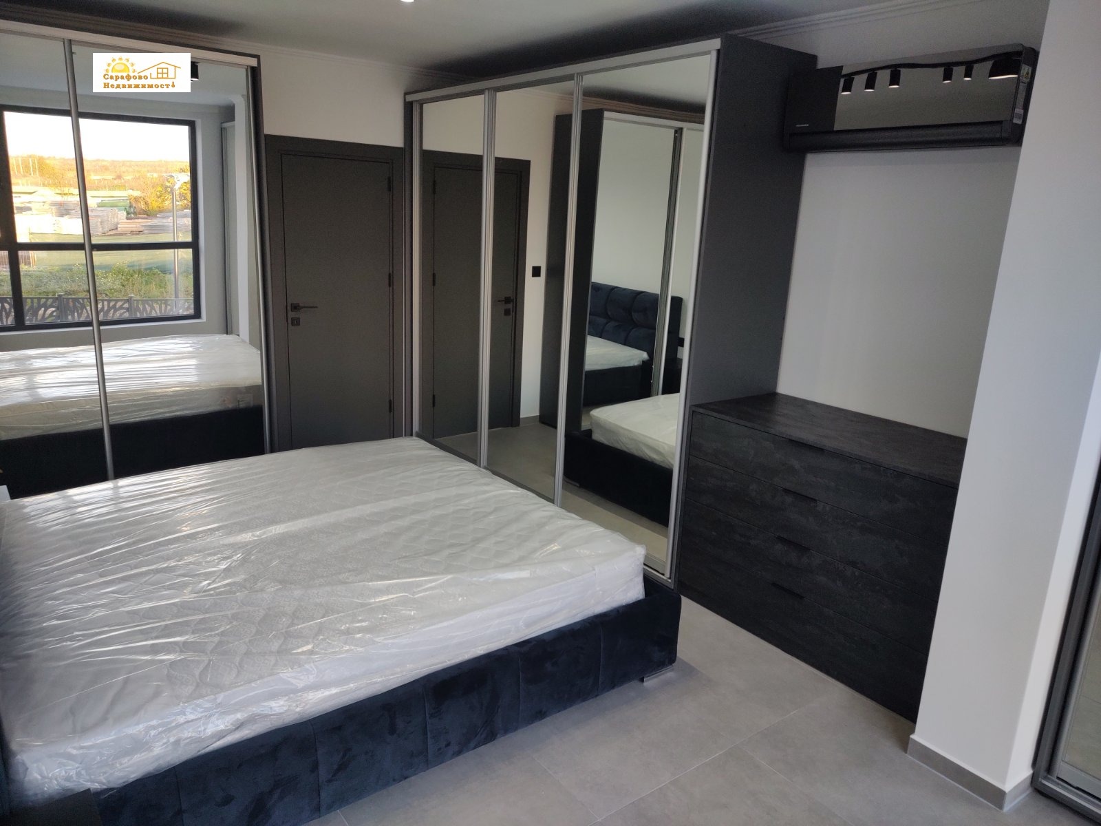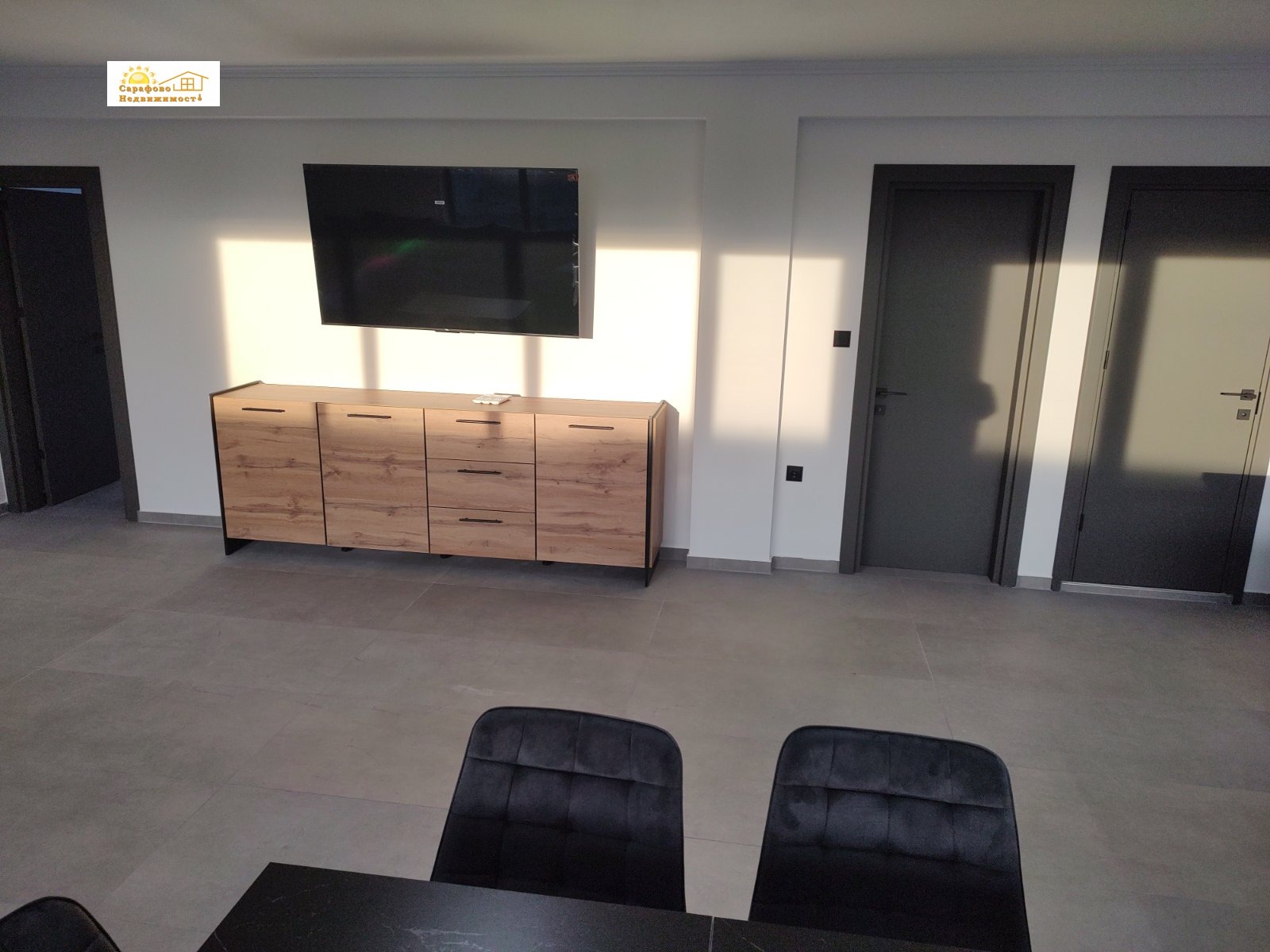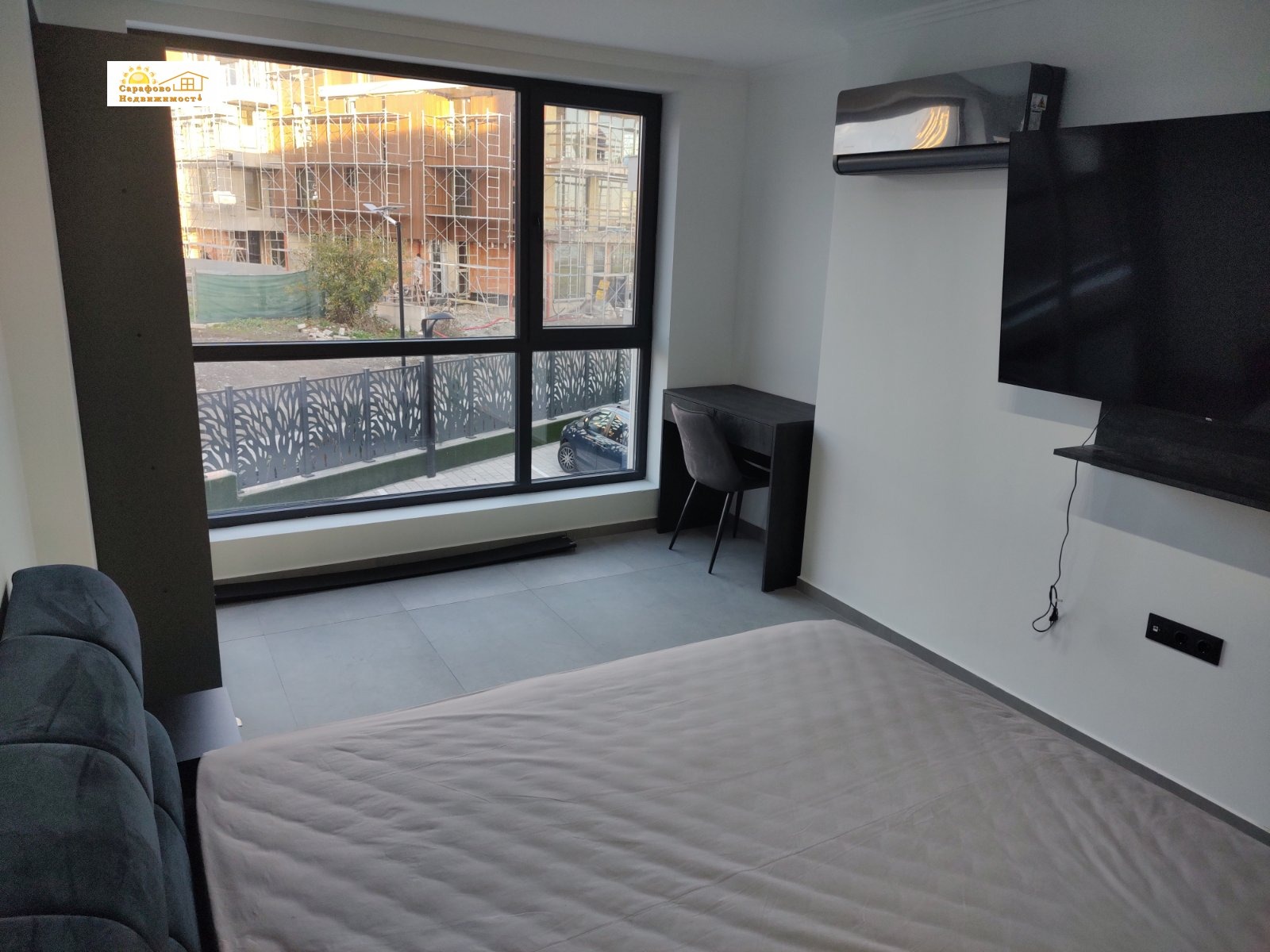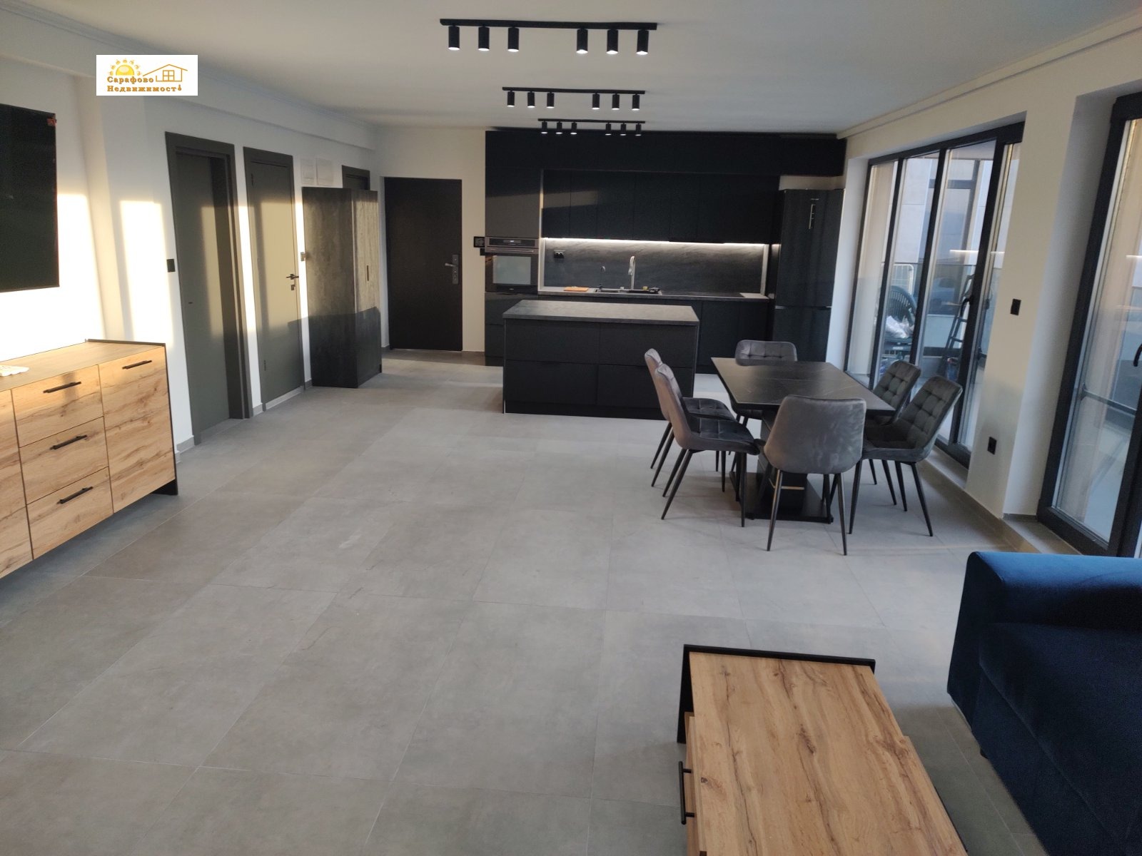 Луксозен тристаен апартамент под наем на първа линия с просторна дневна и спални. Имотът е в луксозна сграда разположена до самият плаж на кв. Сарафово. Жилището се предлага за първи път под наем, като към месечният наем е включена такса поддръжка на сградата и две паркоместа.