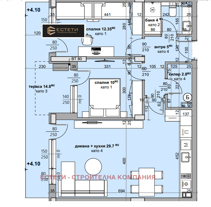 🏡 Тистаен апартамент, състоящ се от: антре, дневна с кухня, 2 спални, баня с тоалетна, килер, тераса . Квадратура - 109,68 кв.м.