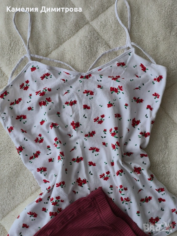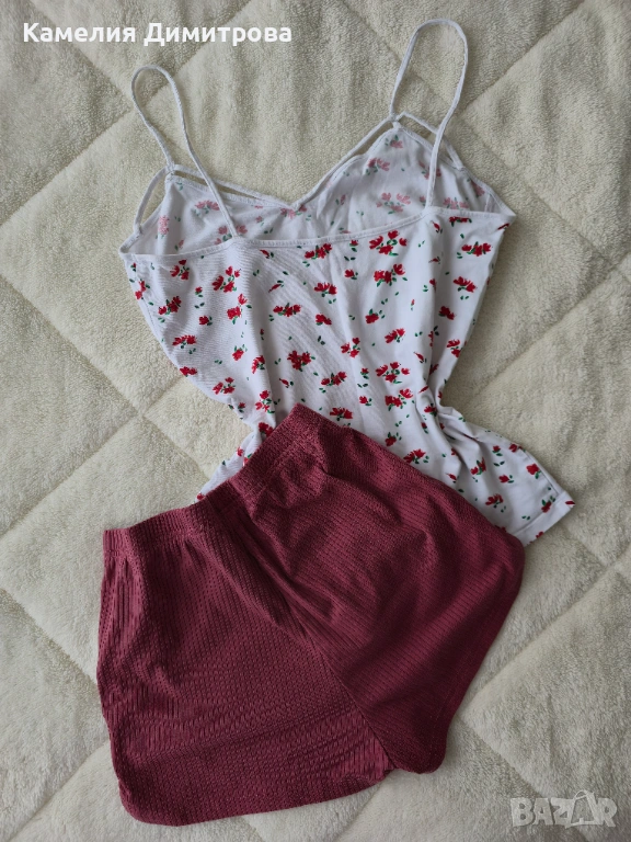 Сладък и удобен дамски комплект, идеален за вкъщи, спане или лежерни летни дни. Включва бял топ с тънки презрамки и нежен флорален десен, комбиниран с бордо къси панталонки.